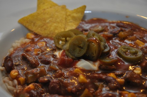 Hæl løgblandingen tilbage i gryden igen og tilsæt krydderierne, tomater, rødvinseddike og chokolade og lad det simre i 2-3 timer. Tilsæt nu bønnerne og majs og smag til med salt og peber.