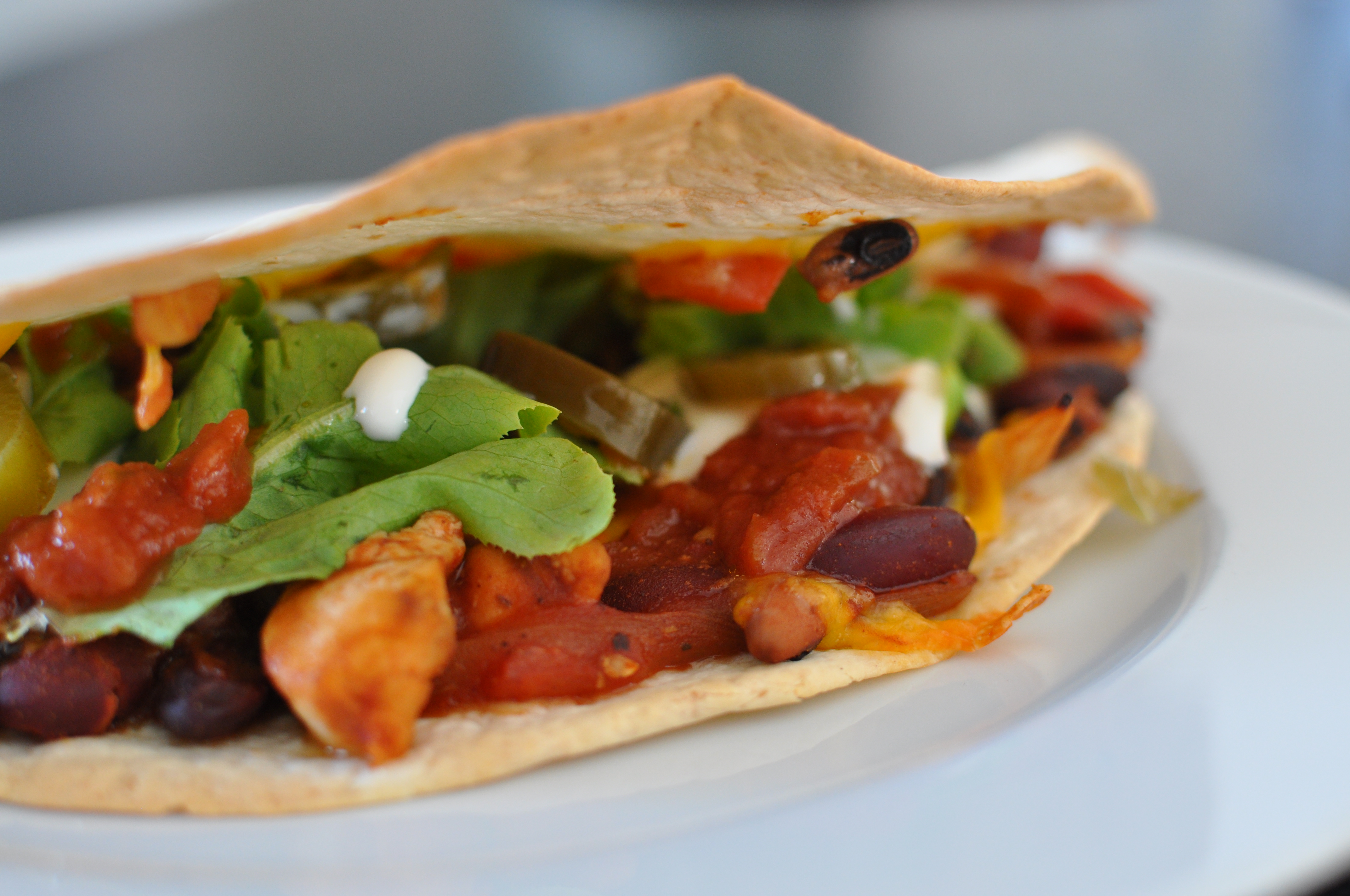 Jeg laver enchiladas af en to tortillas lagt sammen med revet cheddarost og frisk koriander i midten. Bages ca. 5 min ved 200 grader varmluft.