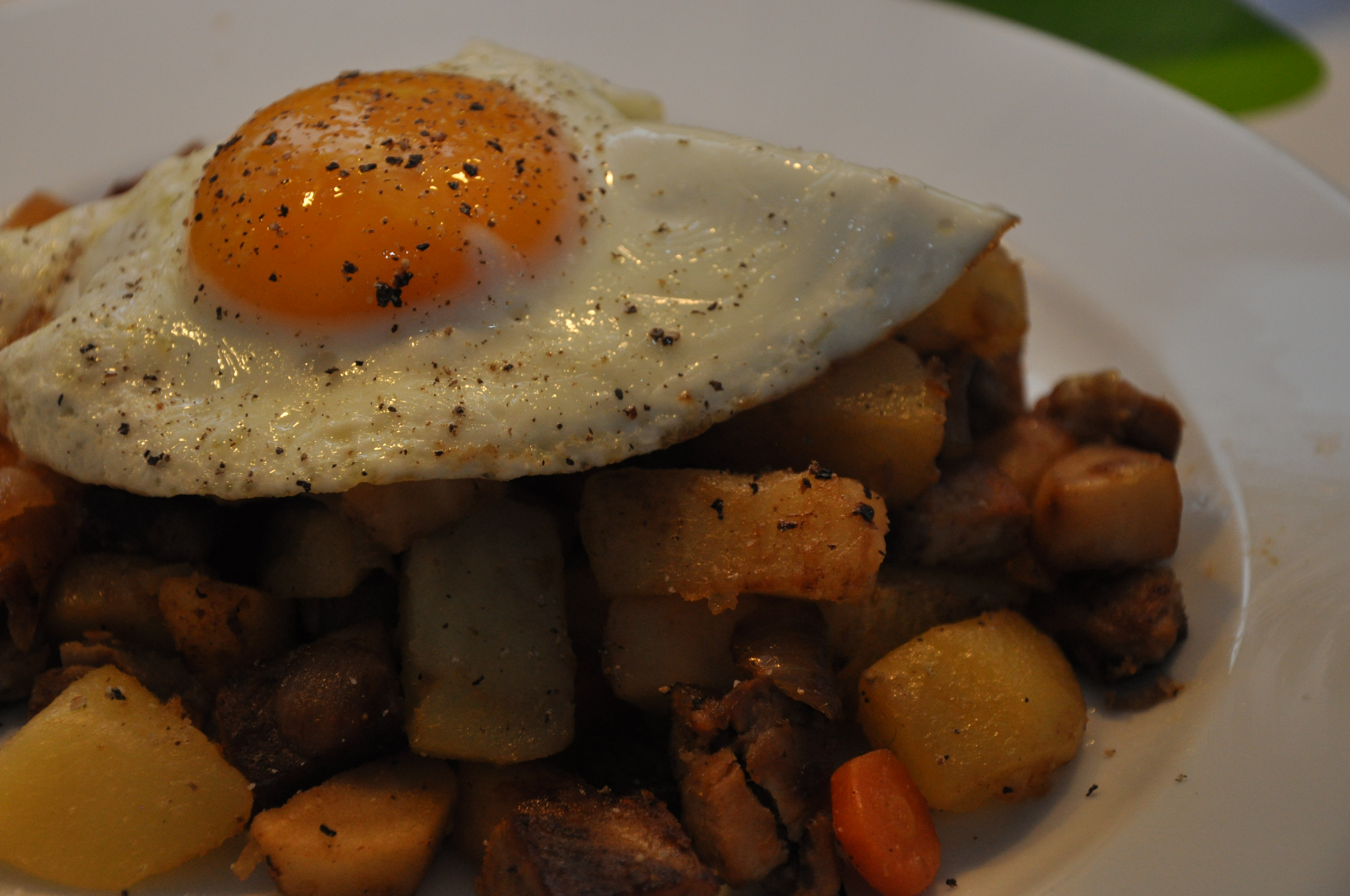 Efter en dejlig weekend i Odense, hvor vi var til bryllup og fik serveret super lækker mad, kom vi sent hjem igår og aftensmaden skulle bare være en hurtig løsning. Et kig i køleskabet resulterede i en masse rodfrugter og æg og i fryseren lå en rest nakkefilet (https://madmedhjerte.wordpress.com/2013/09/03/nakkefilet-med-stegte-rodfrugter/), så det var oplagt at forsøge sig med en gang biksemad lavet på rodfrugter.