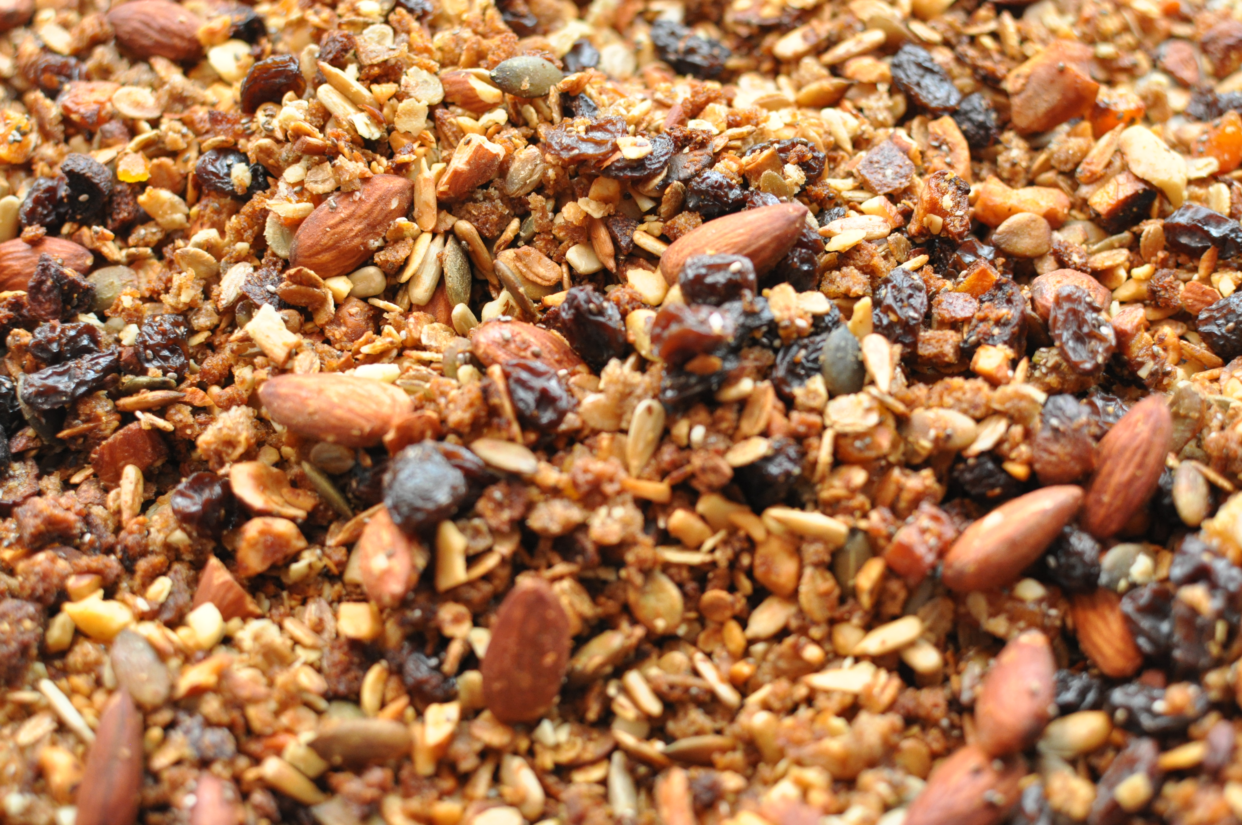 Hak rugbrødet fint i en minihakker lidt af gangen. Hak herefter nødderne, men lad den ene håndfuld mandler være hele. Skær abrikoserne helt fint ud i minitern. Bland det sammen i en skål med de andre ingredienser på nær rosinerne.