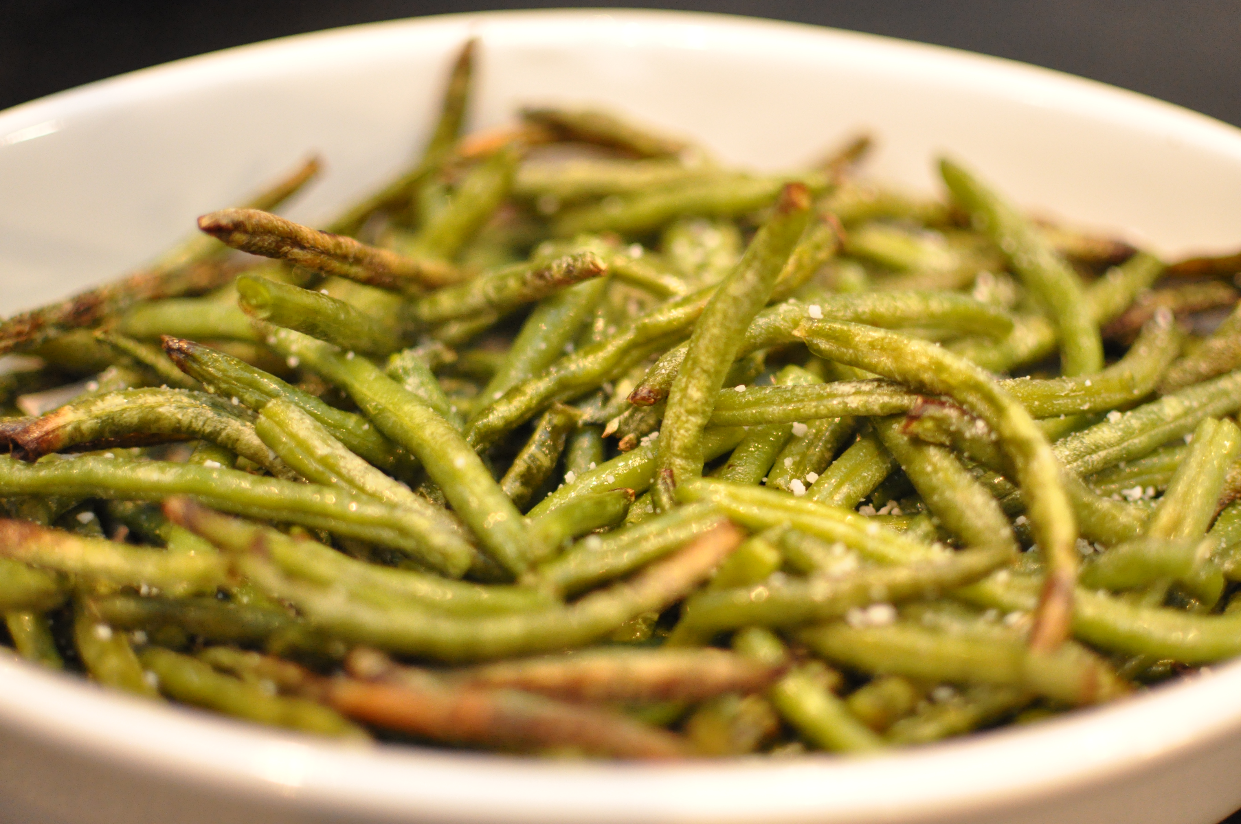 Fritterne består af 1/2 pose frosne haricot vert der blandes med 2 spk. olivenolie i en frostpose. Det hele rystes godt sammen så olien bliver godt fordelt og bages i ca 20 min i en 200 grader varm ovn til de er gyldne og sprøde. Hvis de ikke er færdige efter 20 min, så giv dem lidt længere.