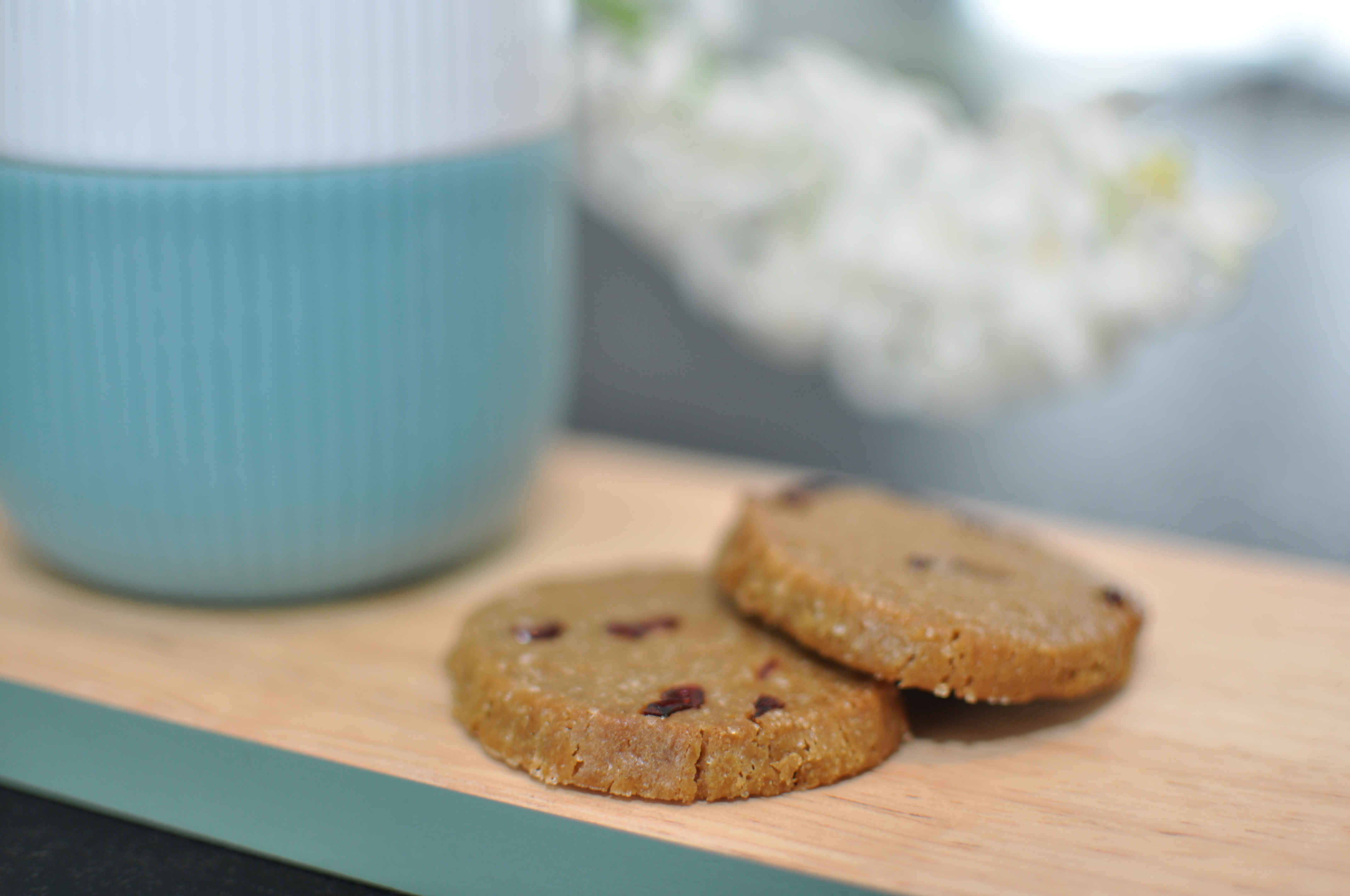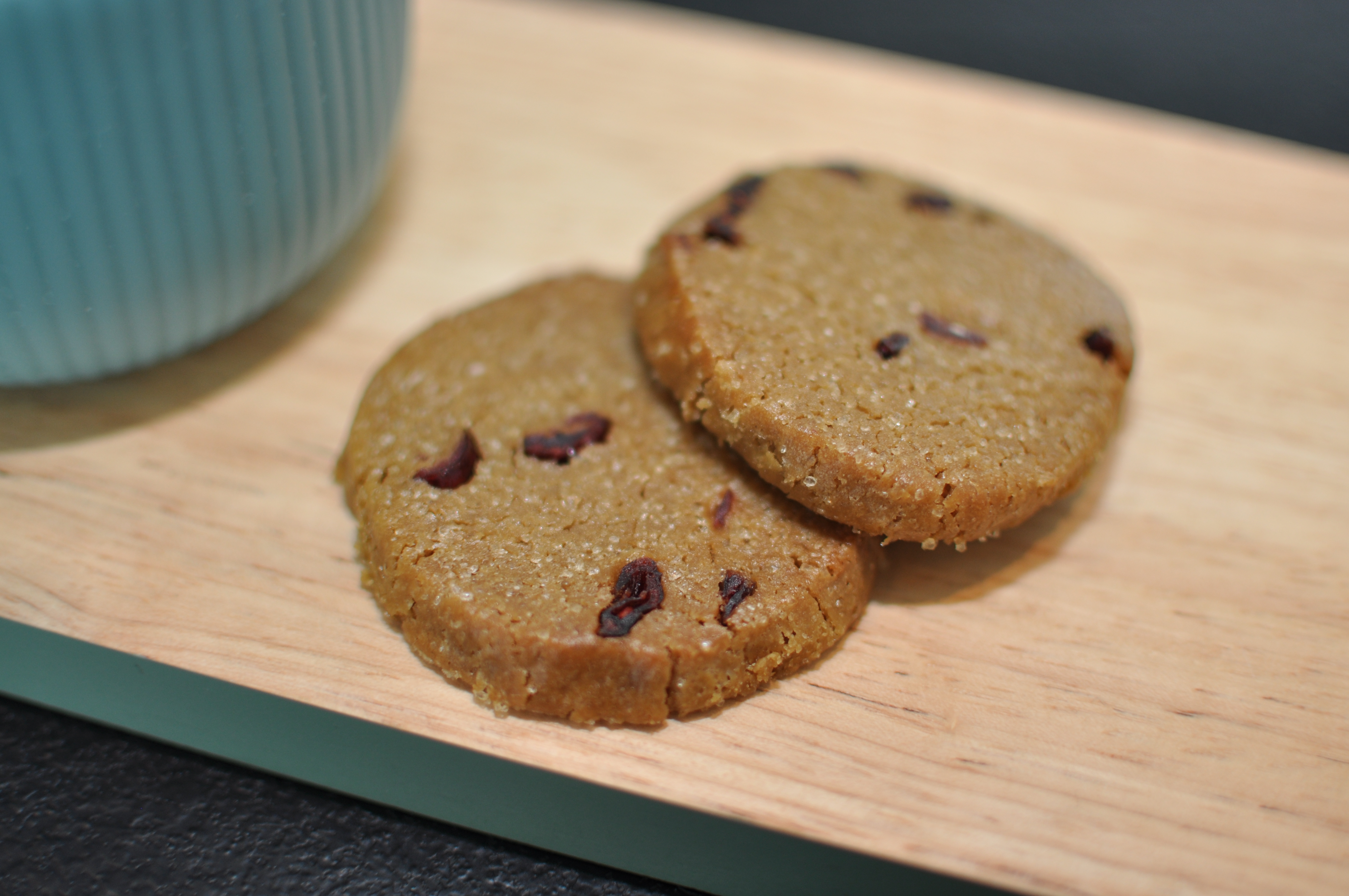 Bland mel, bagepulver, lakridspulver, tranebær og det bløde smør i små stykker i en røremaskine og lad den køre til massen er blandet godt sammen. Tilsæt æg og sukker og rør det med til dejen har samlet sig. Jeg brugte hænderne til sidst.