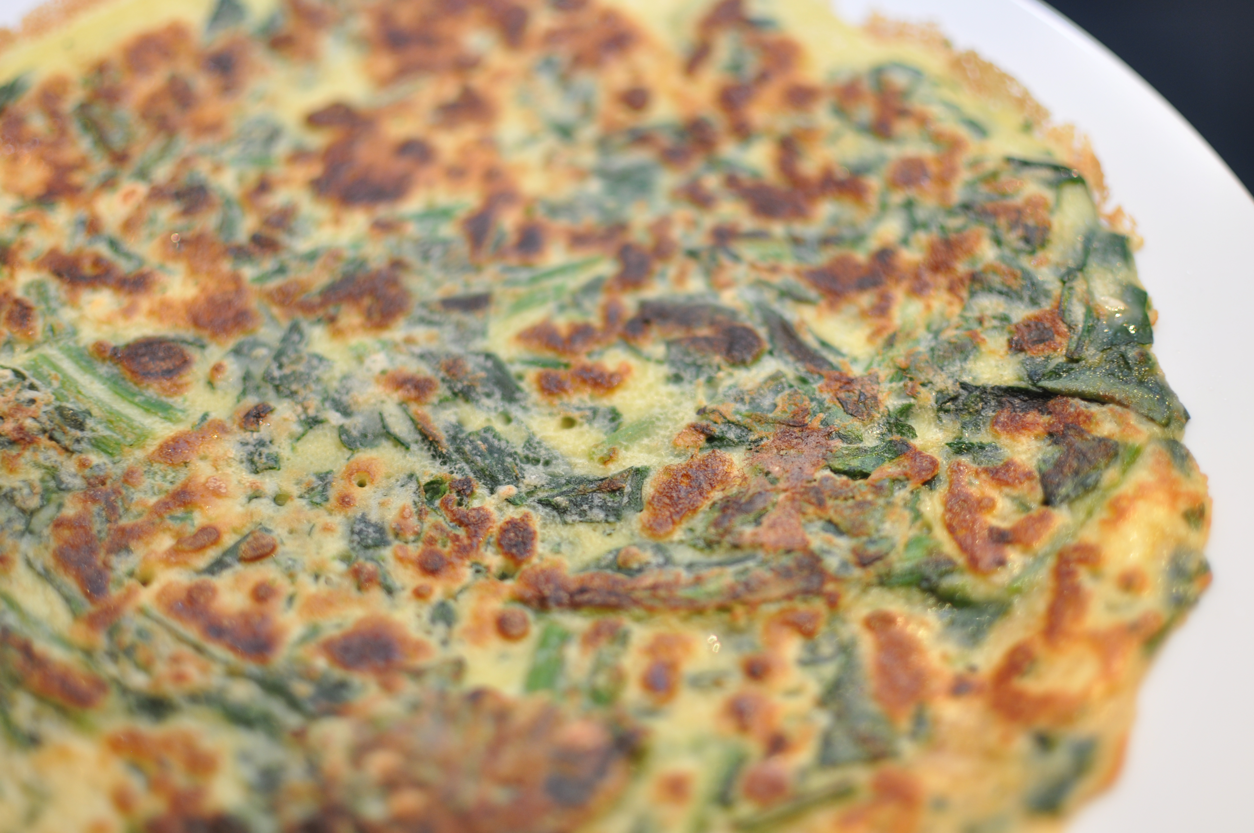 Pisk æg, mælk, mel, salt og spinat sammen. Varm en pande godt op – jeg brugte en pandekage pande – og smelt smørret. Bag pandekagerne ved høj varme, men pas på de ikke brænder på.