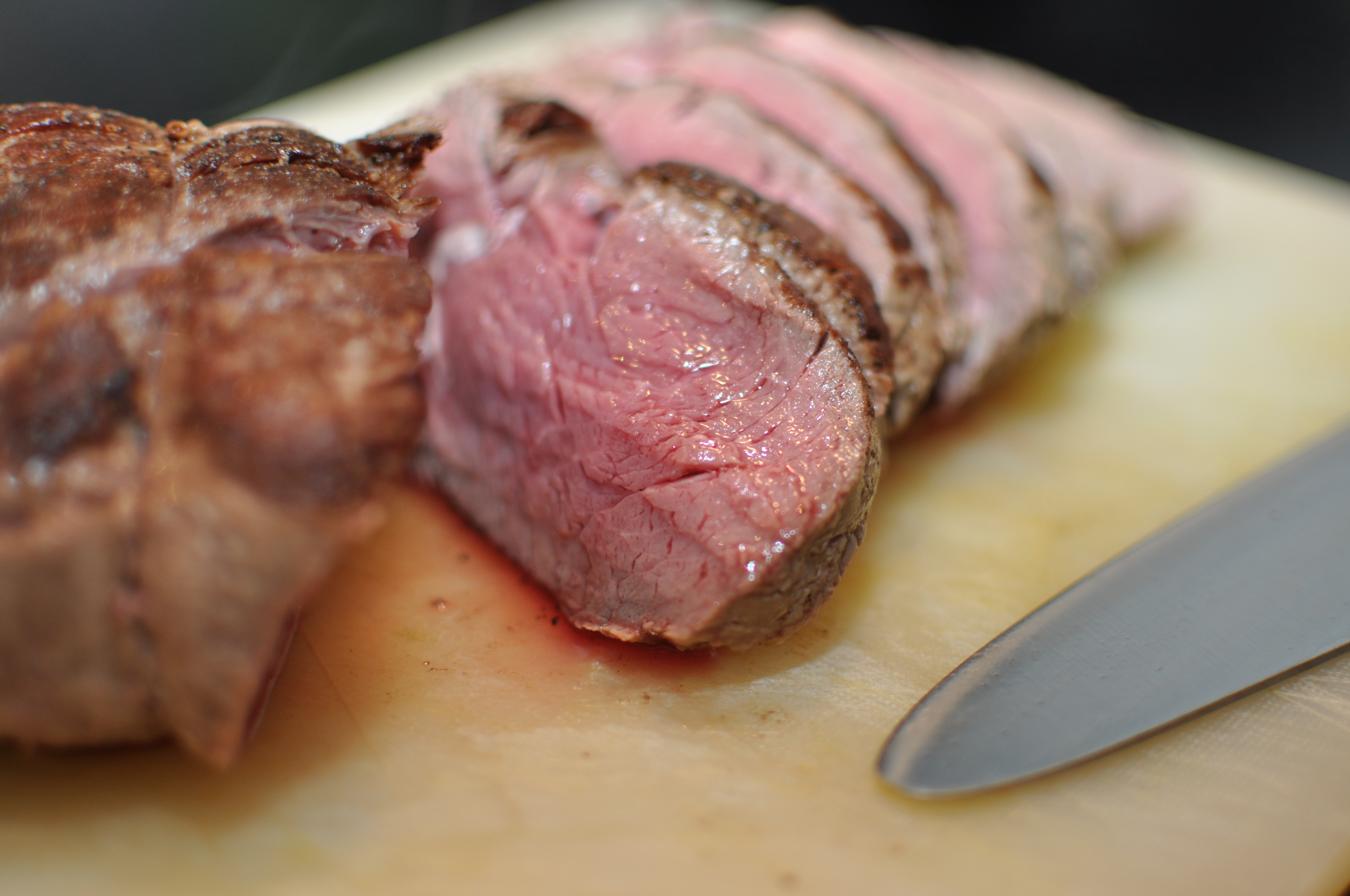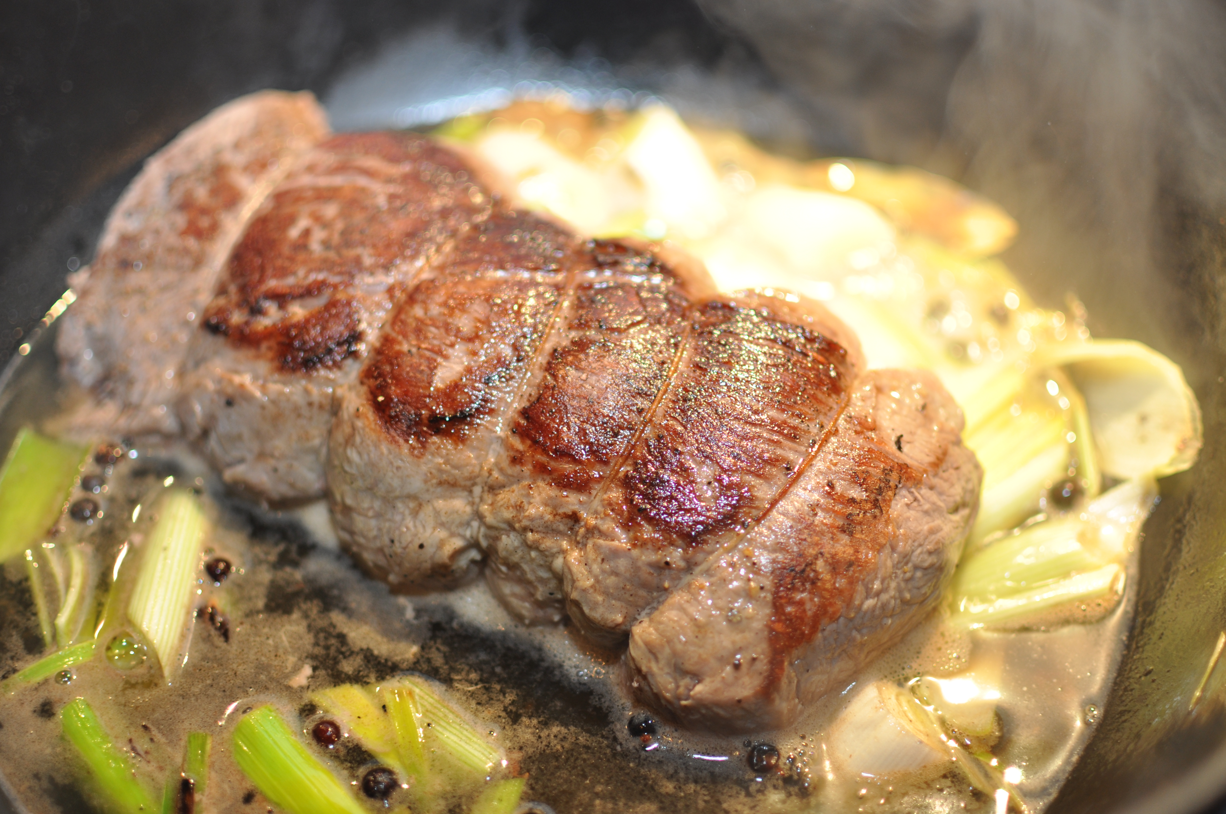 Varm en god gryde op og brun smørret af. Brun stegen hele vejen rundt og krydder med lidt ekstra salt og peber. Tilsæt porrerne, lauerbær og lidt enebær og til sidst hælder du vandet ved. Sæt et stegetermometer i stegen og læg låget på gryden. Lad den simre til termometeret viser 57 grader. Det går ret hurtigt 🙂
