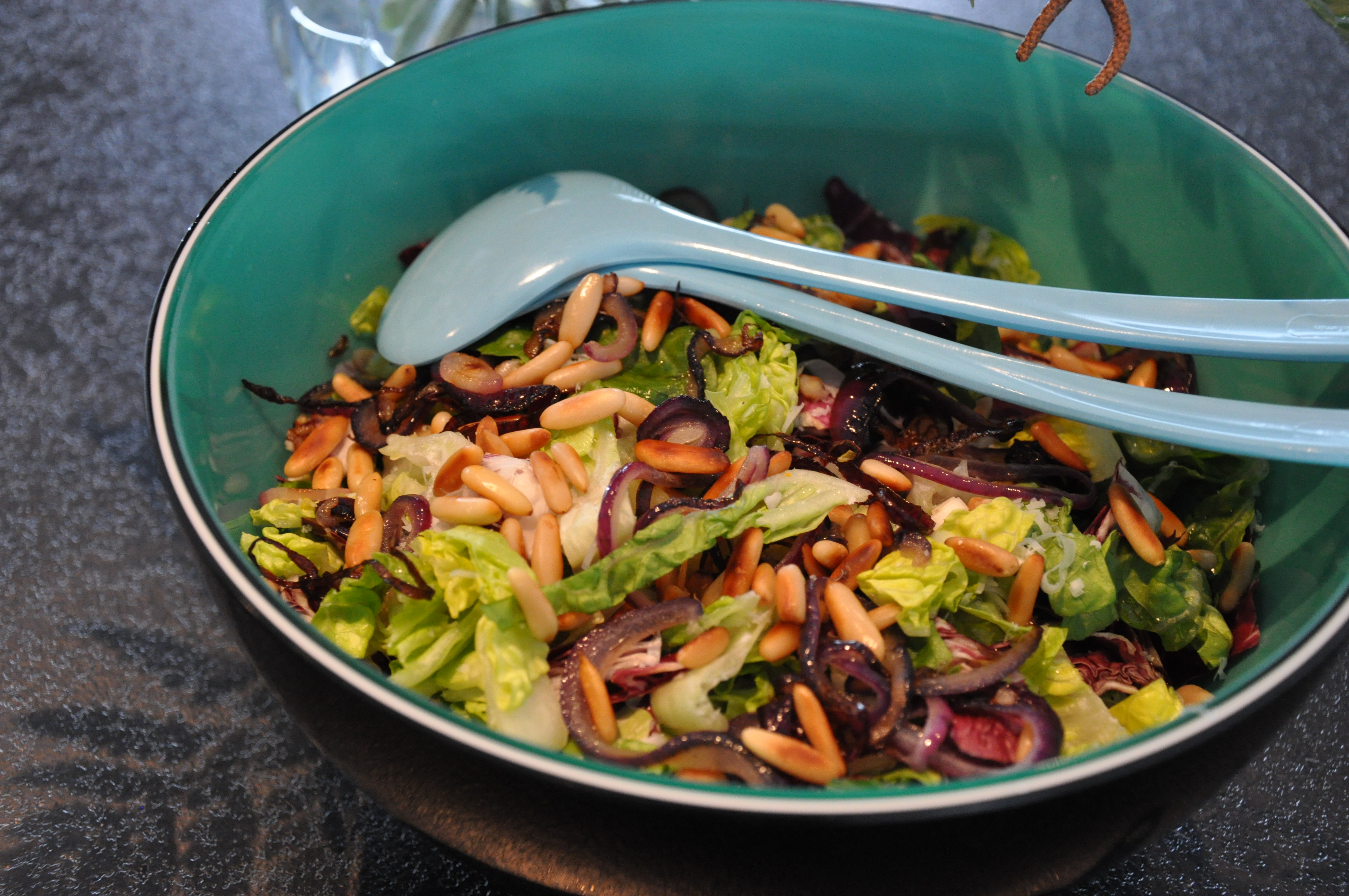 Jeg serverede pasta med hjemmelavet pesto og denne salat af radichio, hjertesalat, ristede pinjekerner, stegte rødløgsringe, parmesan og en god olivenolie samt nybagte hvidløgsbrød med frisk persille.