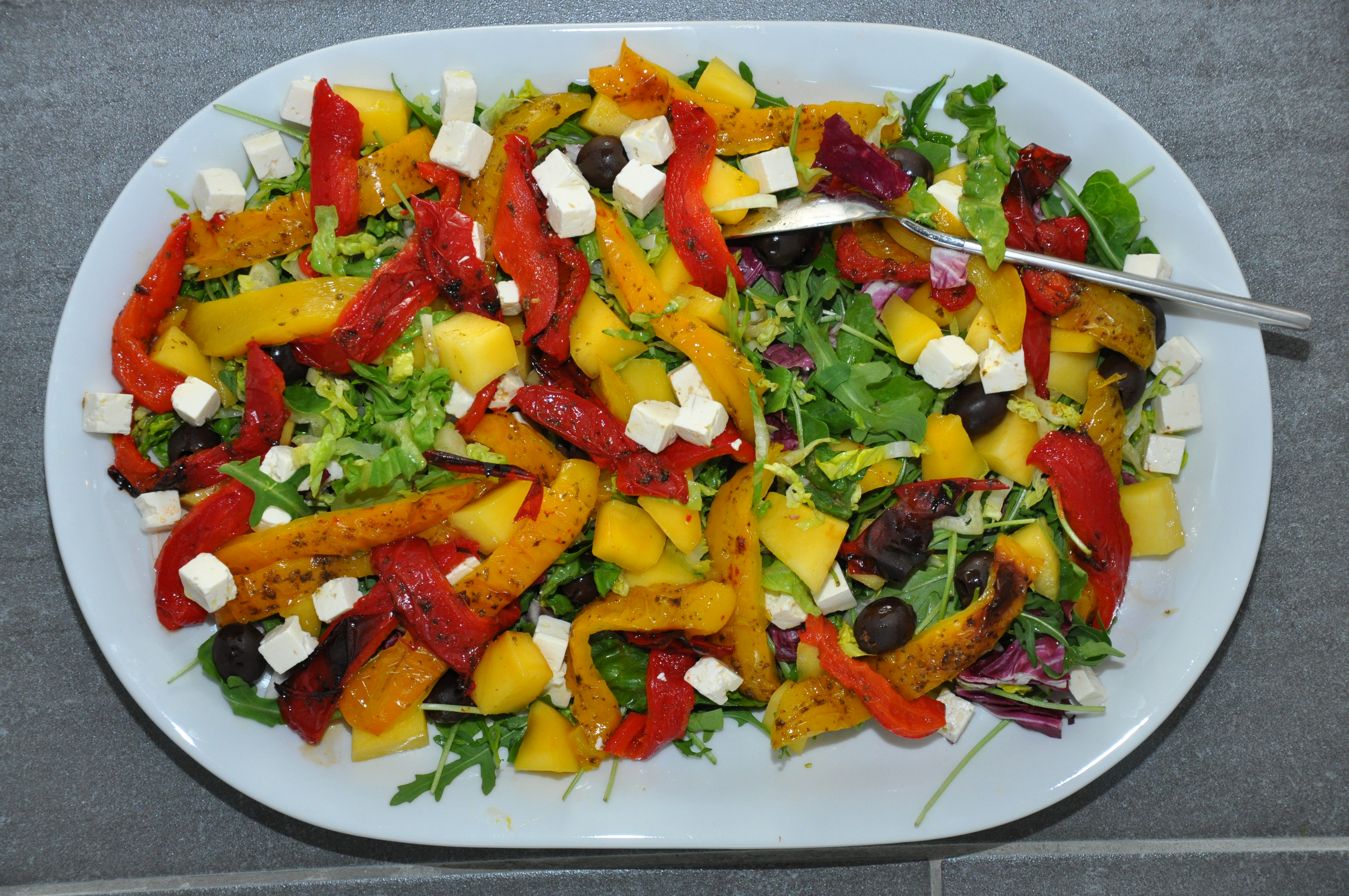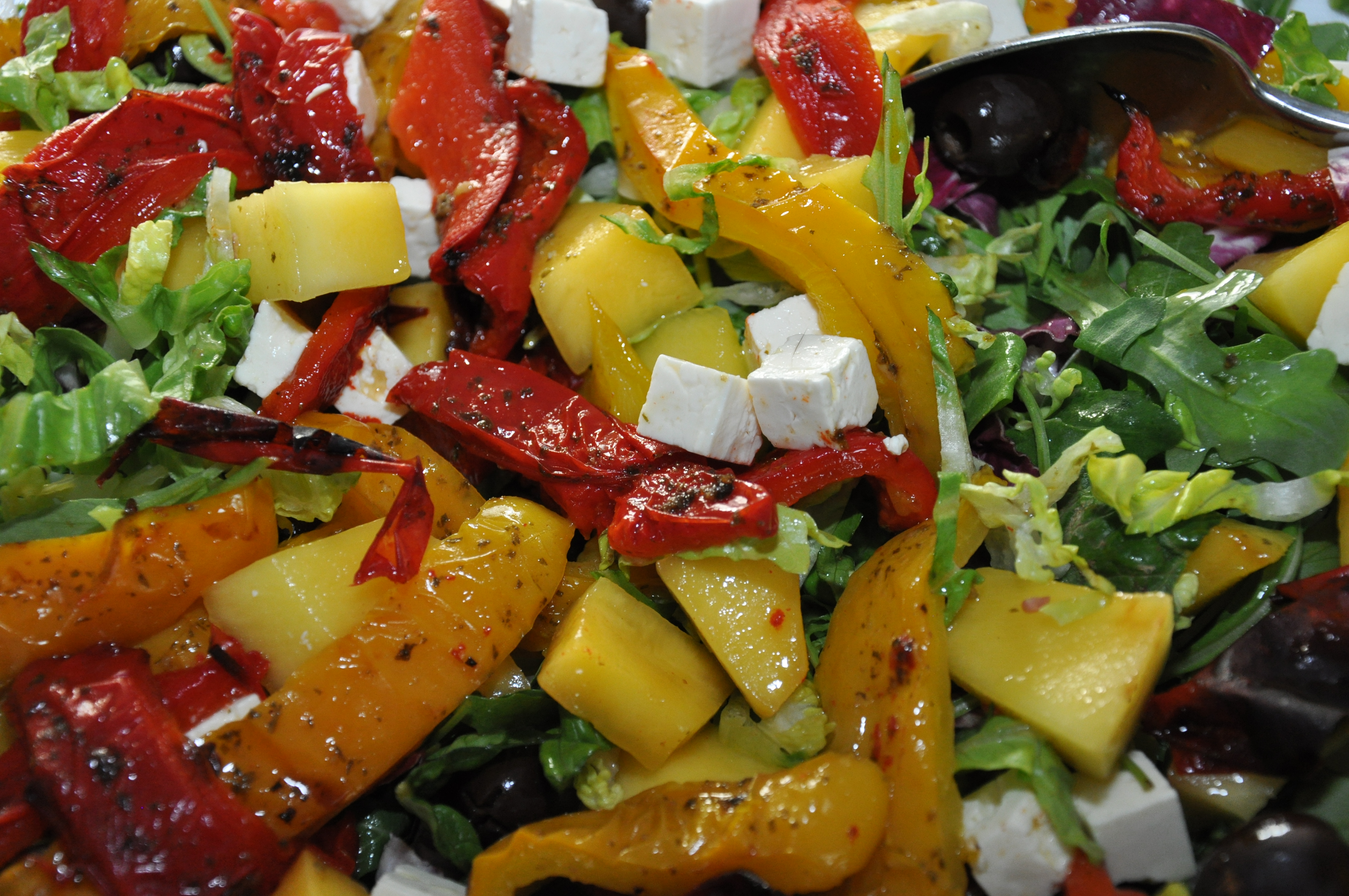 Skær mangoen i tern og fordel den sammen med peberfrugt, oliven og feta over salaten og dryp med en god olivenolie.