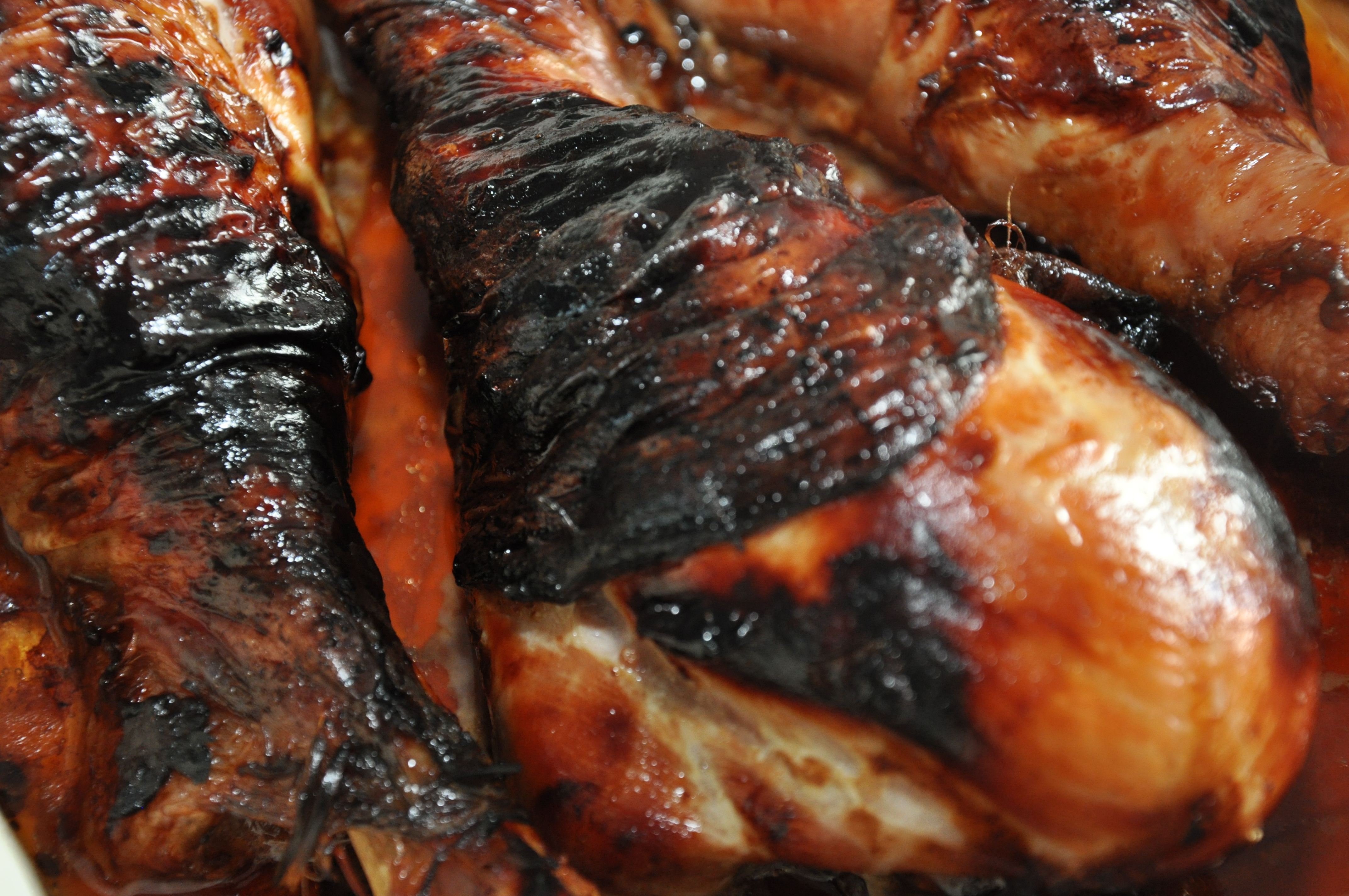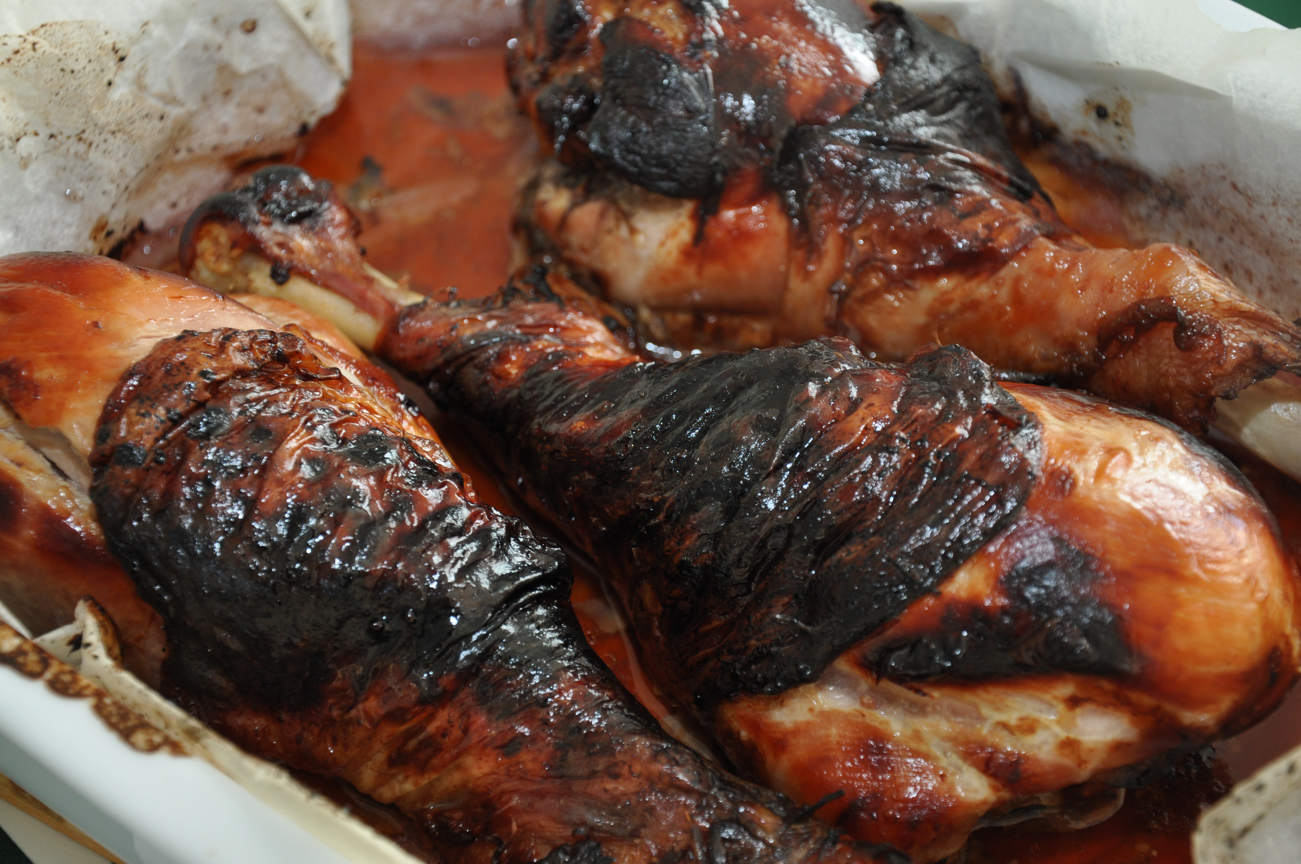 Jeg har dog ikke set kalkunlår nogen steder jeg normalt handler, men for en måneds tid siden så jeg en annonce hvor man kunne få 3 for 25 kr! Så det blev der straks købt ind og smidt i fryseren. Igår blev de så lavet i en asiatisk version med en klistret honningmarinade i ovnen.