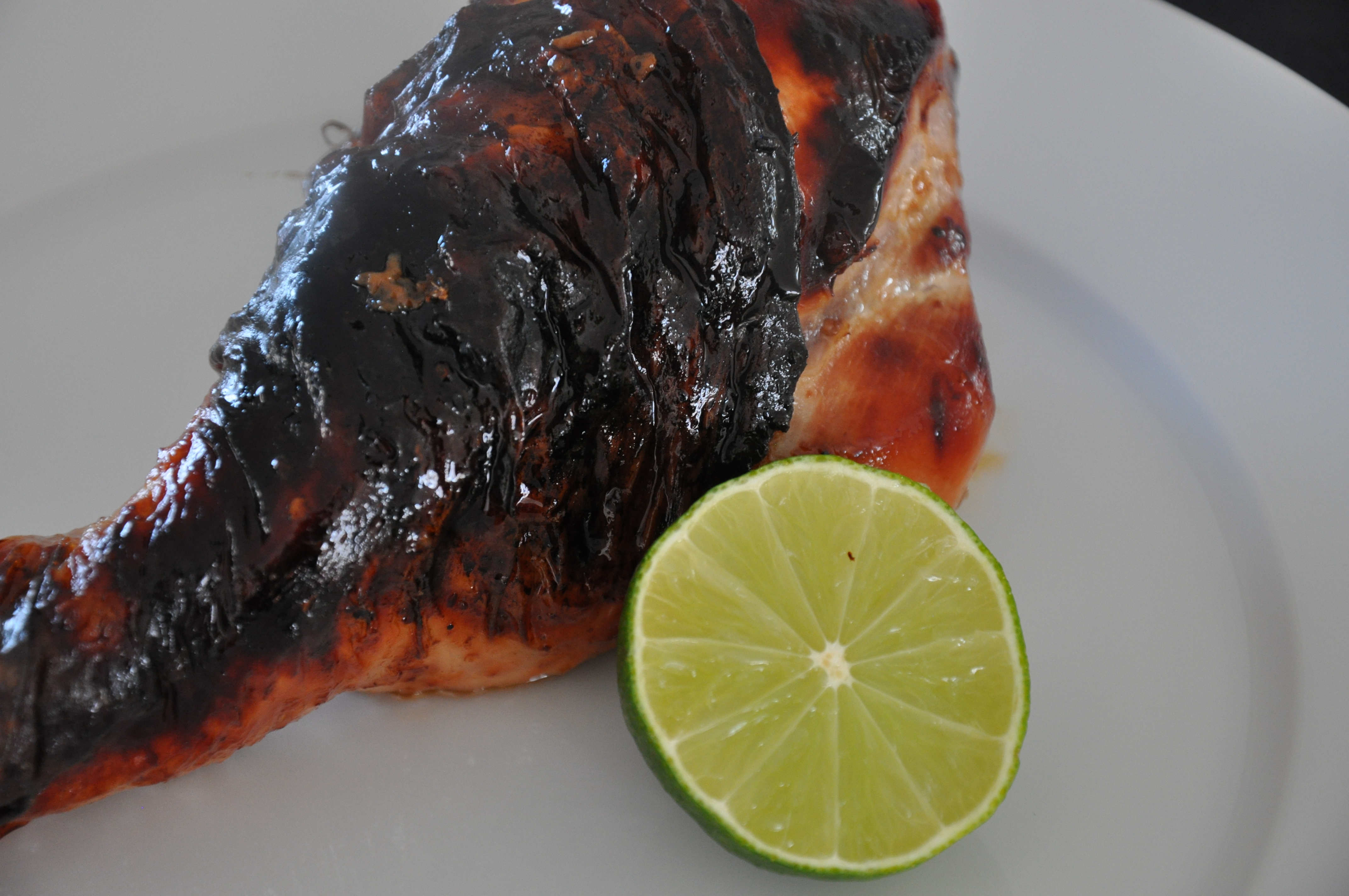 Rør marinaden sammen. Den skal være god tyk. Dup lårerne af med køkkenrulle og læg dem i et ovnfast fad beklædt med bagepapir. Smør marinaden godt ud på dem og sæt dem i en 200 grader varm ovn i 50 min.