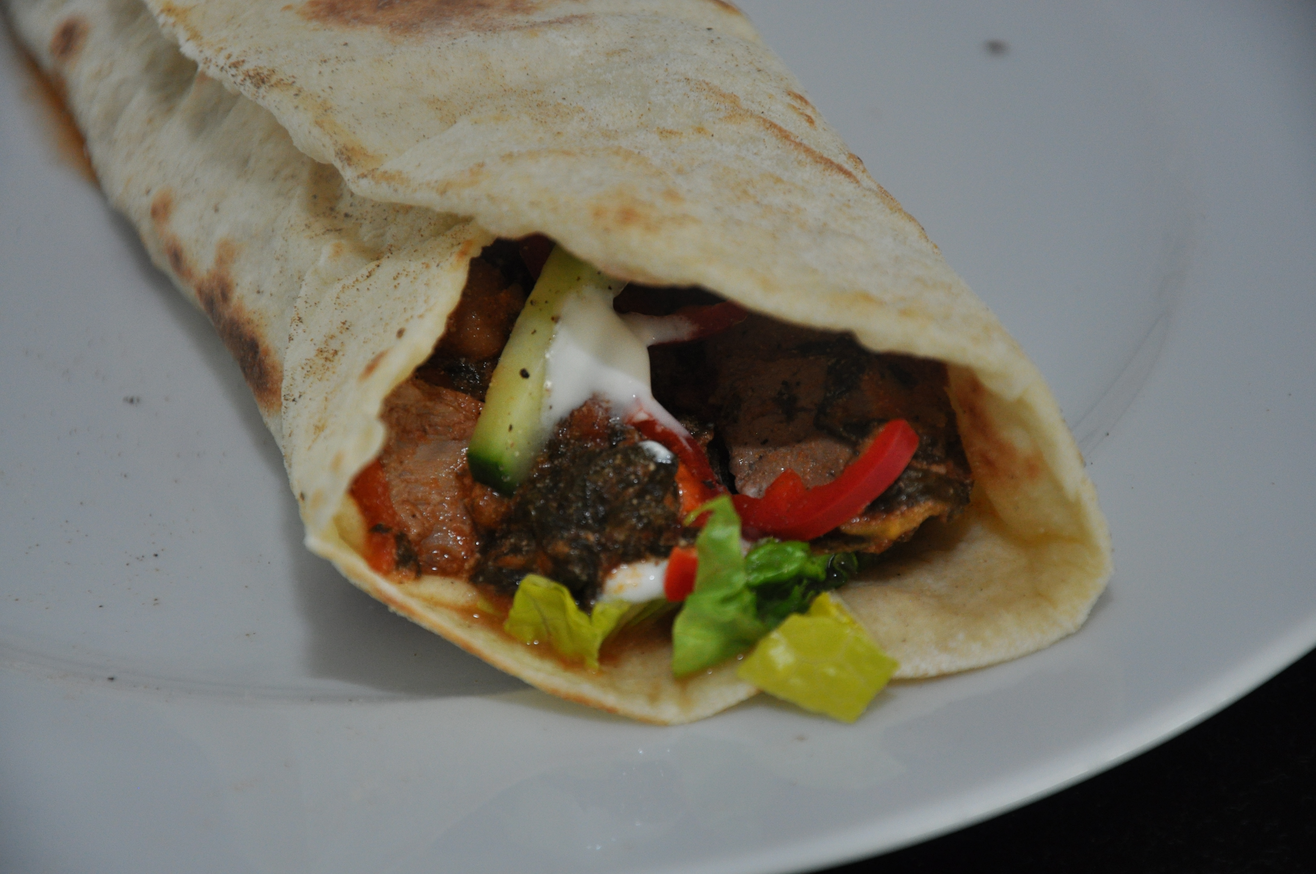 Sidste indlæg i trilogien om påskelammekøllen slutter i aften, hvor jeg lavede fladbrød hvor resterne af lammegryden kom i som fyld sammen med hjertesalat, agurkstrimler, frisk citronsaft, , yoghurt og rød chili. Og det er så nemt at lave fladbrødene selv, så kast dig endelig ud i det!