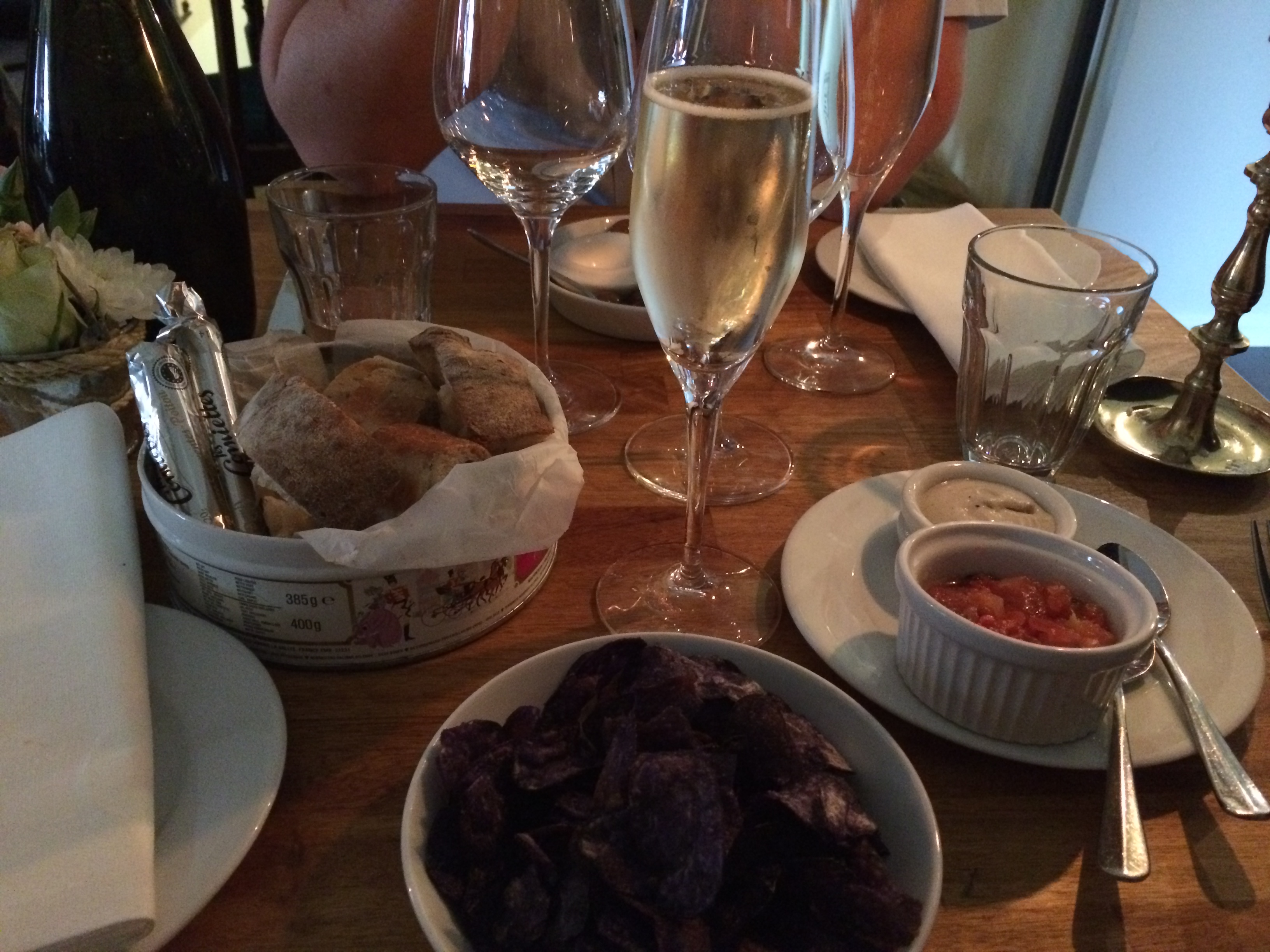 Velkomst bobler, oliven, svampecreme, tomatsalsa, friskbagtbrød og blå franske kartoffelchips.
