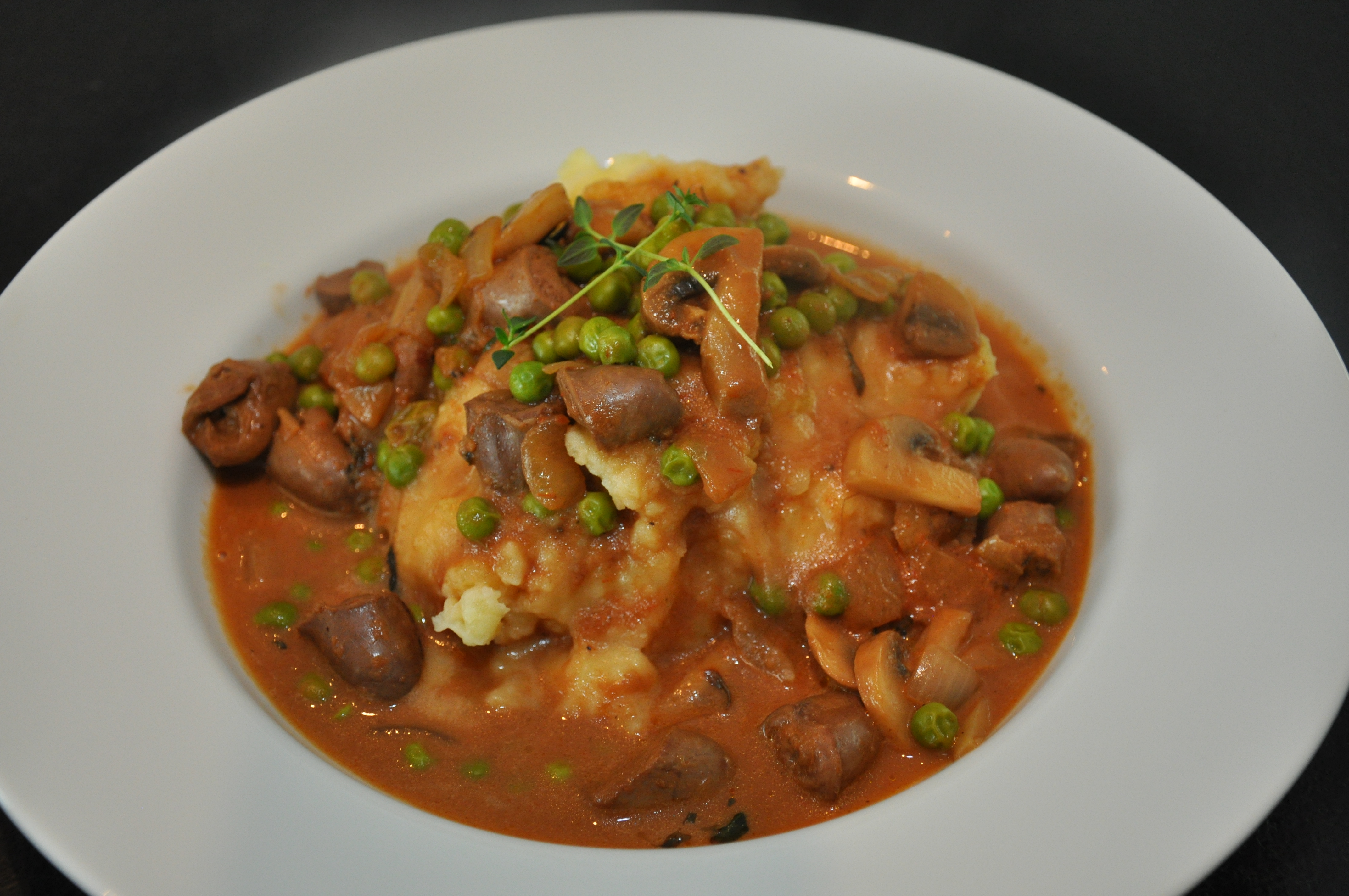 Hæld nu vand, tomatpure og ærter ved og lad det simre i 15 min. Tilsæt fløde og smag til med salt og peber samt timian og du har nu en lækker gammel dansk ret klart til servering. Gerne med kartoffelmos.