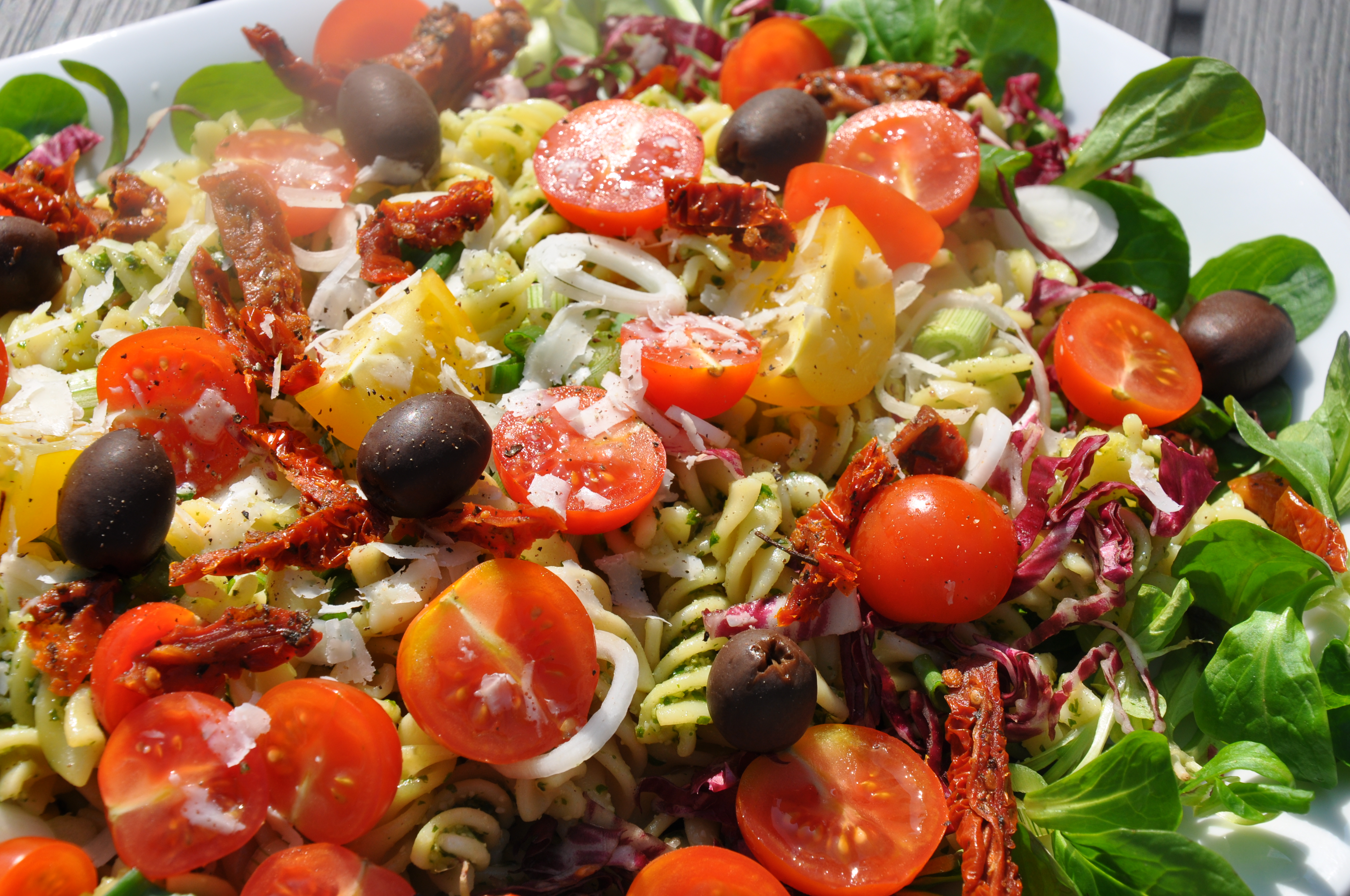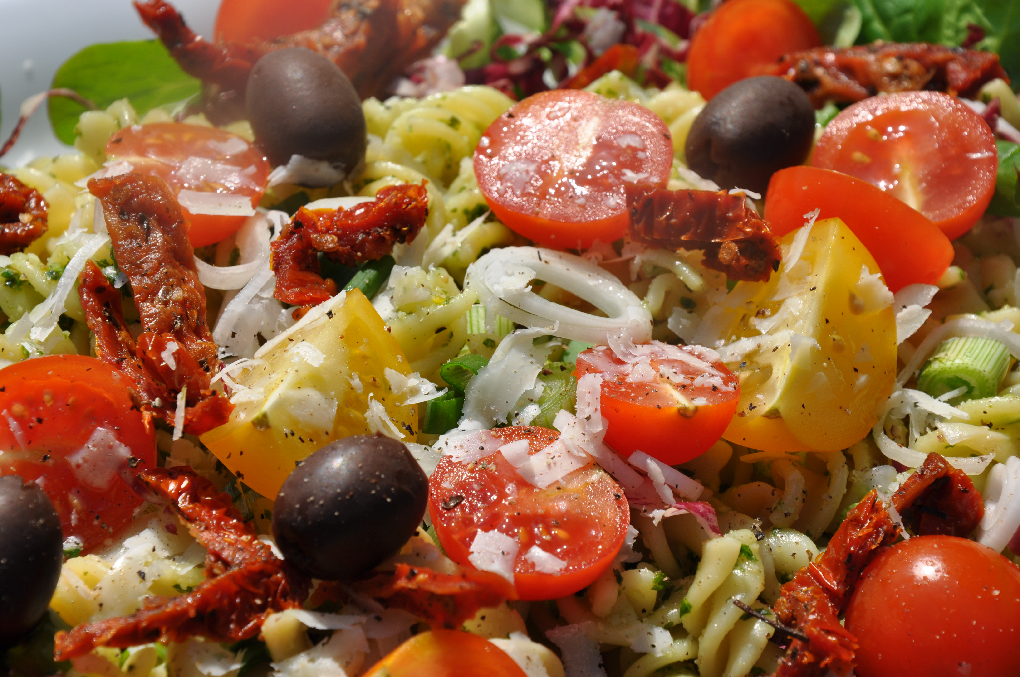 Anret salaten i et serveringsfad med salaten i en ring i kanten og pastaen i midten. Pynt med cherrytomater i halve, oliven, soltørrede tomater i strimler, forårsløg i ringe, oliven og friskrevet parmesan og friskkværnet peber.