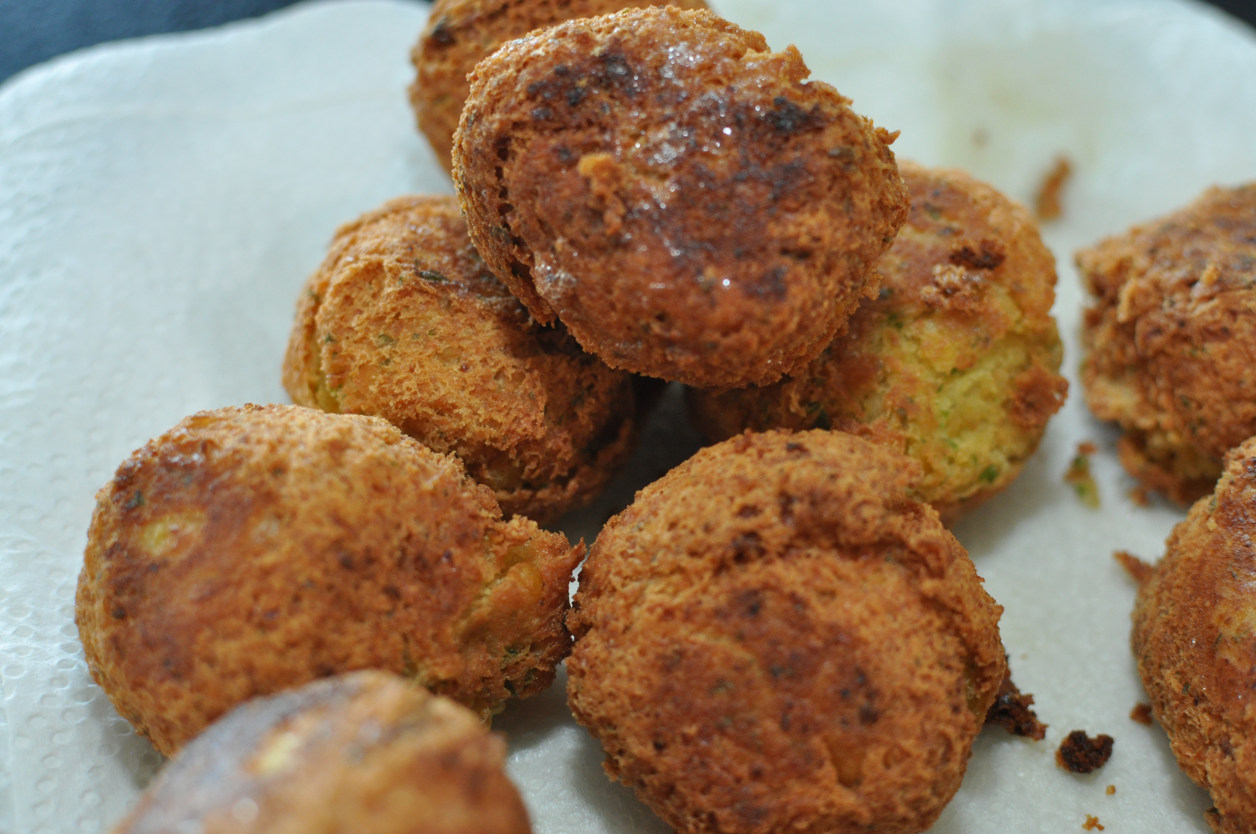 Form små kugler af dejen og læg dem klar på en tallerken. Varm olien op til det syder når du stikker en tandstik ned i overfladen. Så er den varm nok.
