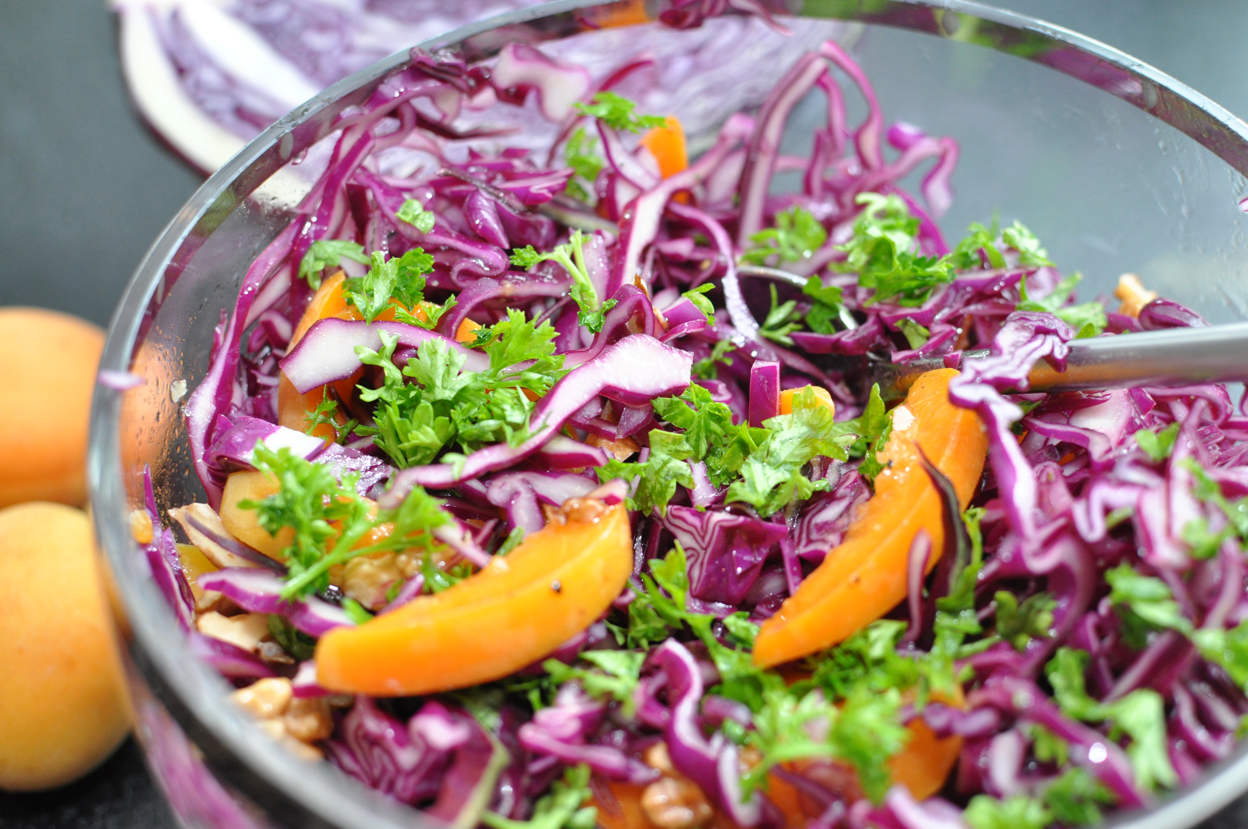 Jeg faldt over et frisk rødkål den anden dag og nogle friske abrikoser, så idag blev forvandlet til denne lette og lækre salat: