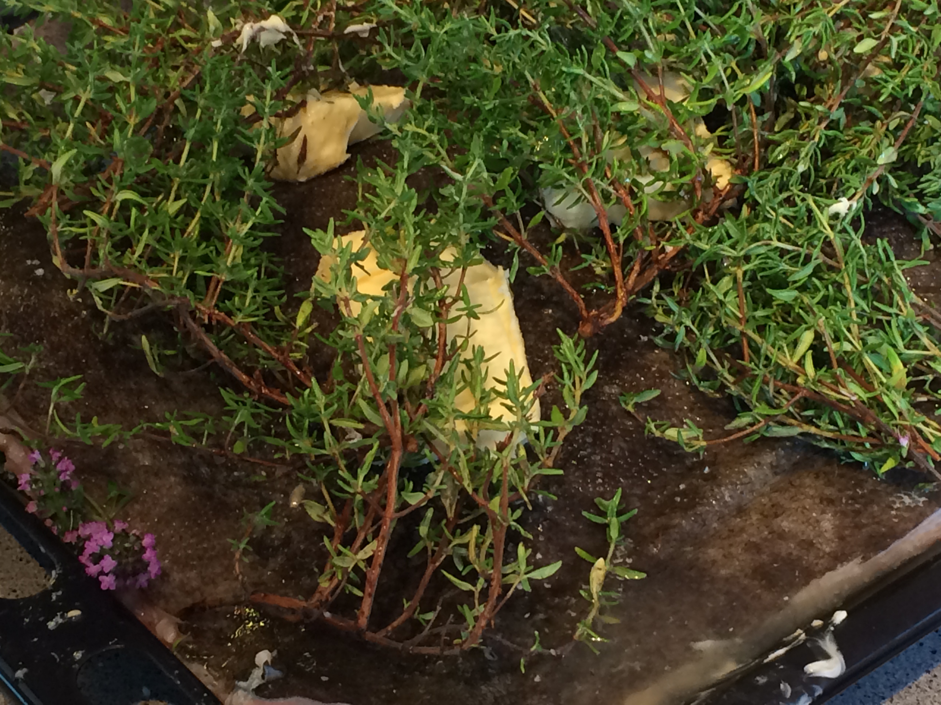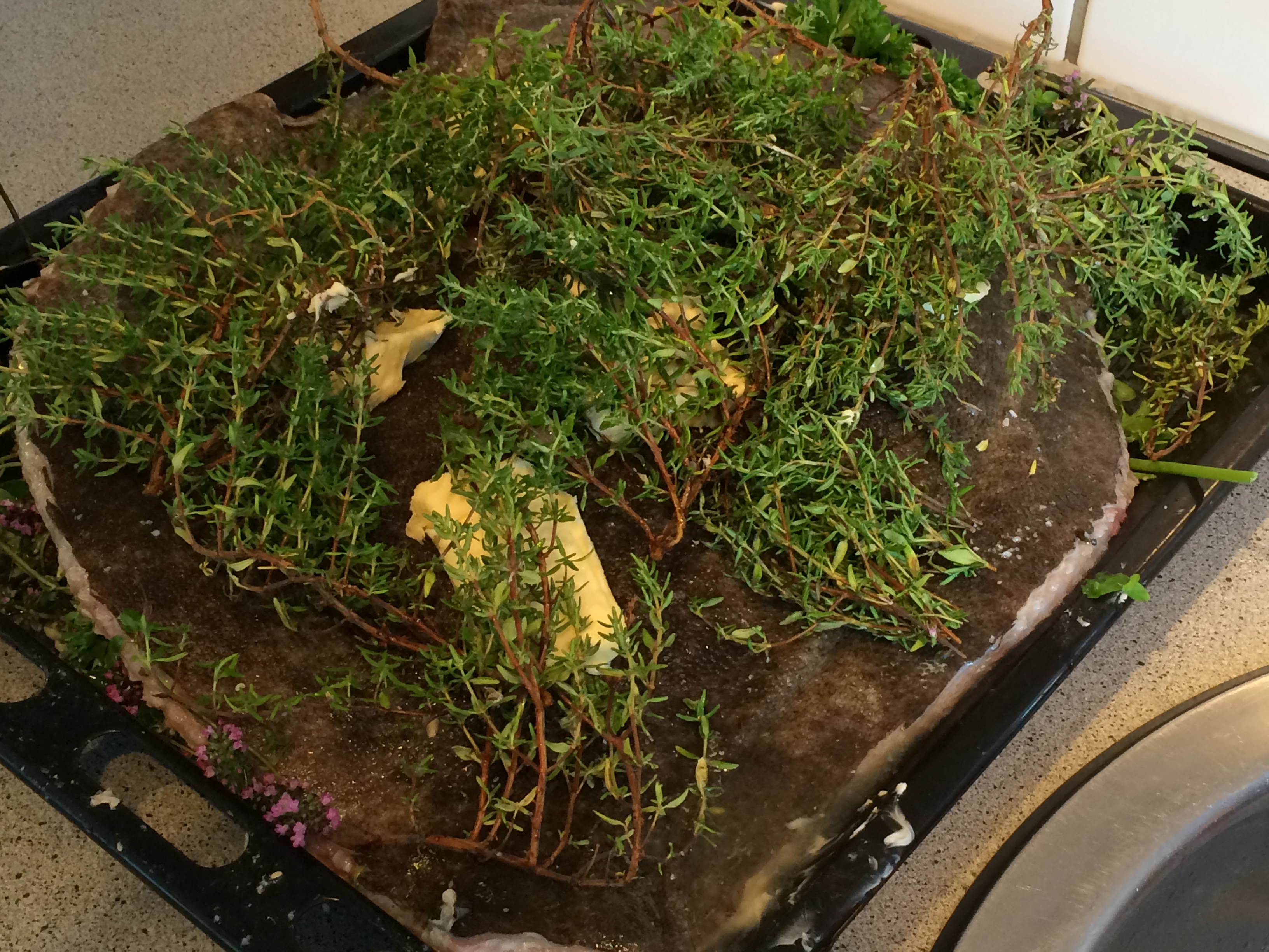 Tag en stor bradepande ud af ovnen. Smør den ind i godt med smør og fordel et lag krydderurter ud over bunden.