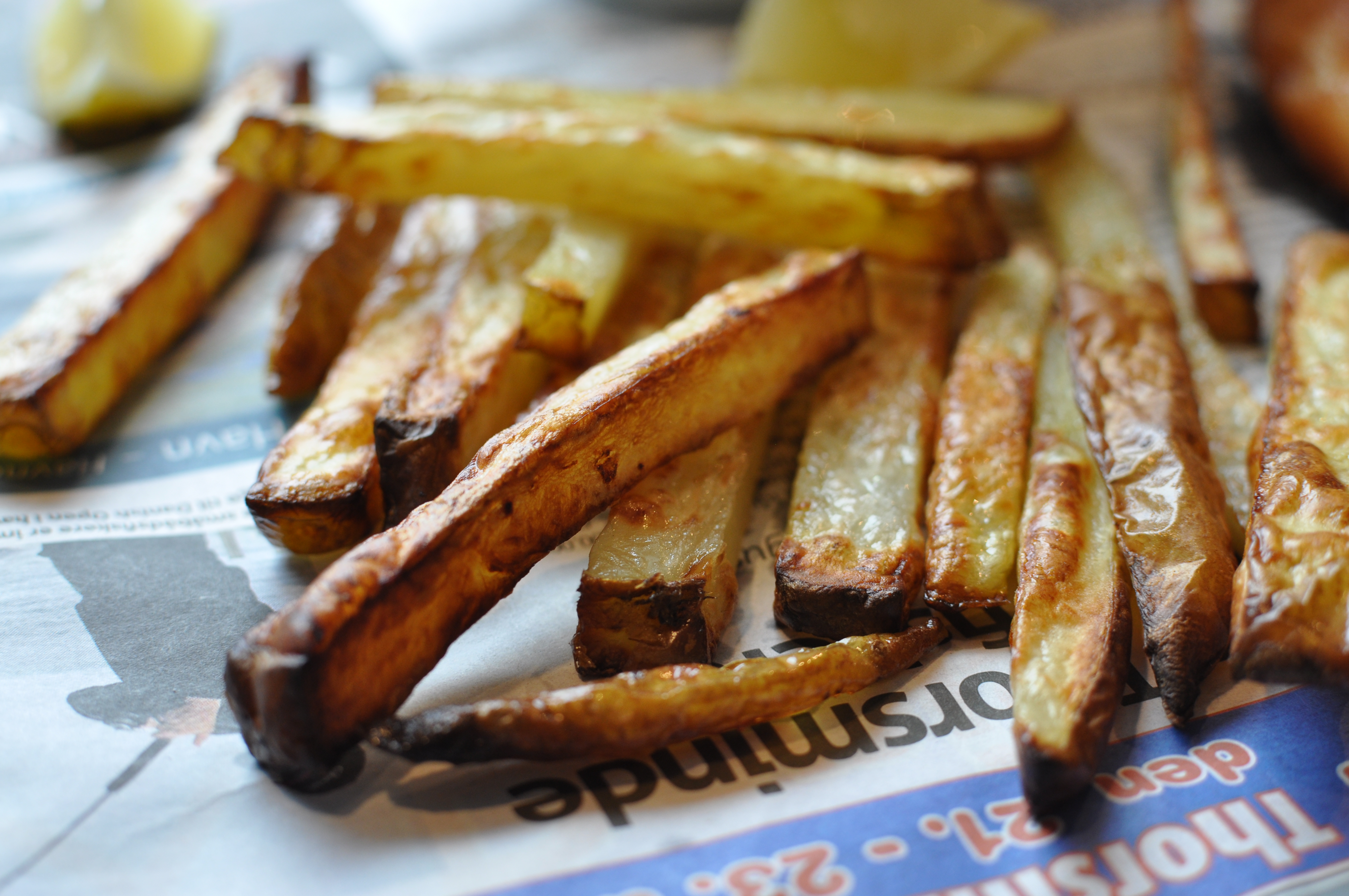 Kartoflerne vaskes og skæres til pommes frites og lægges i en frostpose. Tilsæt lidt olivenolie og vend godt rundt og ud på en bageplade og i ovnen i ca. 30 min ved 230 grader. Vend i dem undervejs, så de bliver ensartet sprøde. Drys med groft salt til sidst.