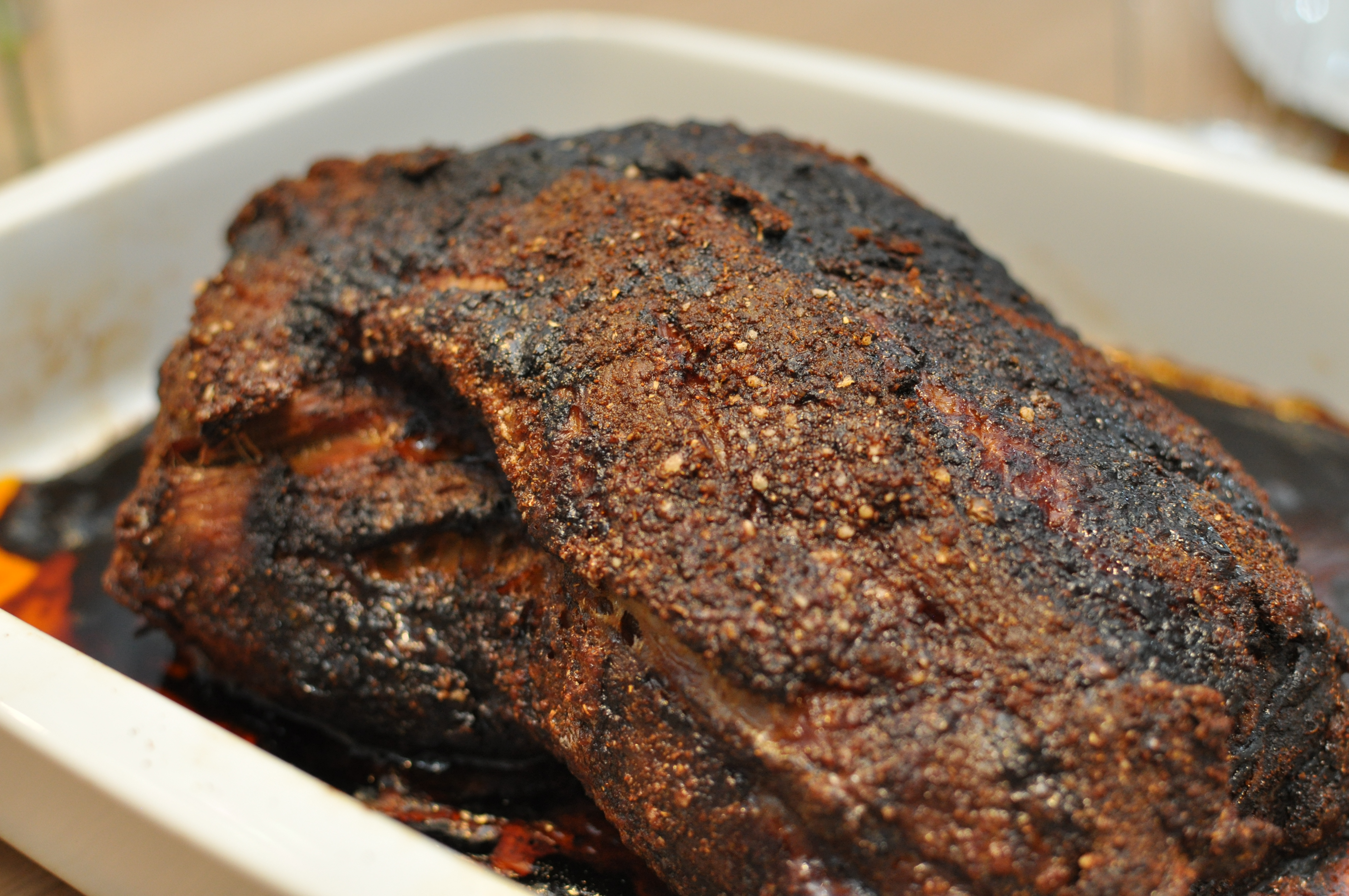 Bland alle ingredienserne godt sammen og gnid blandingen godt ind i kødet. Læg det i et fad og sæt det i en 100 grader varm ovn i 11-12 timer. Efter 10 timer øgede jeg ovntemperaturen til 110 grader. Kødet skal have en kernetemperatur på 95 grader. Før er det ikke færdigt. Lad kødet hvile i 20 min inden du piller det fra hinanden med to gafler.