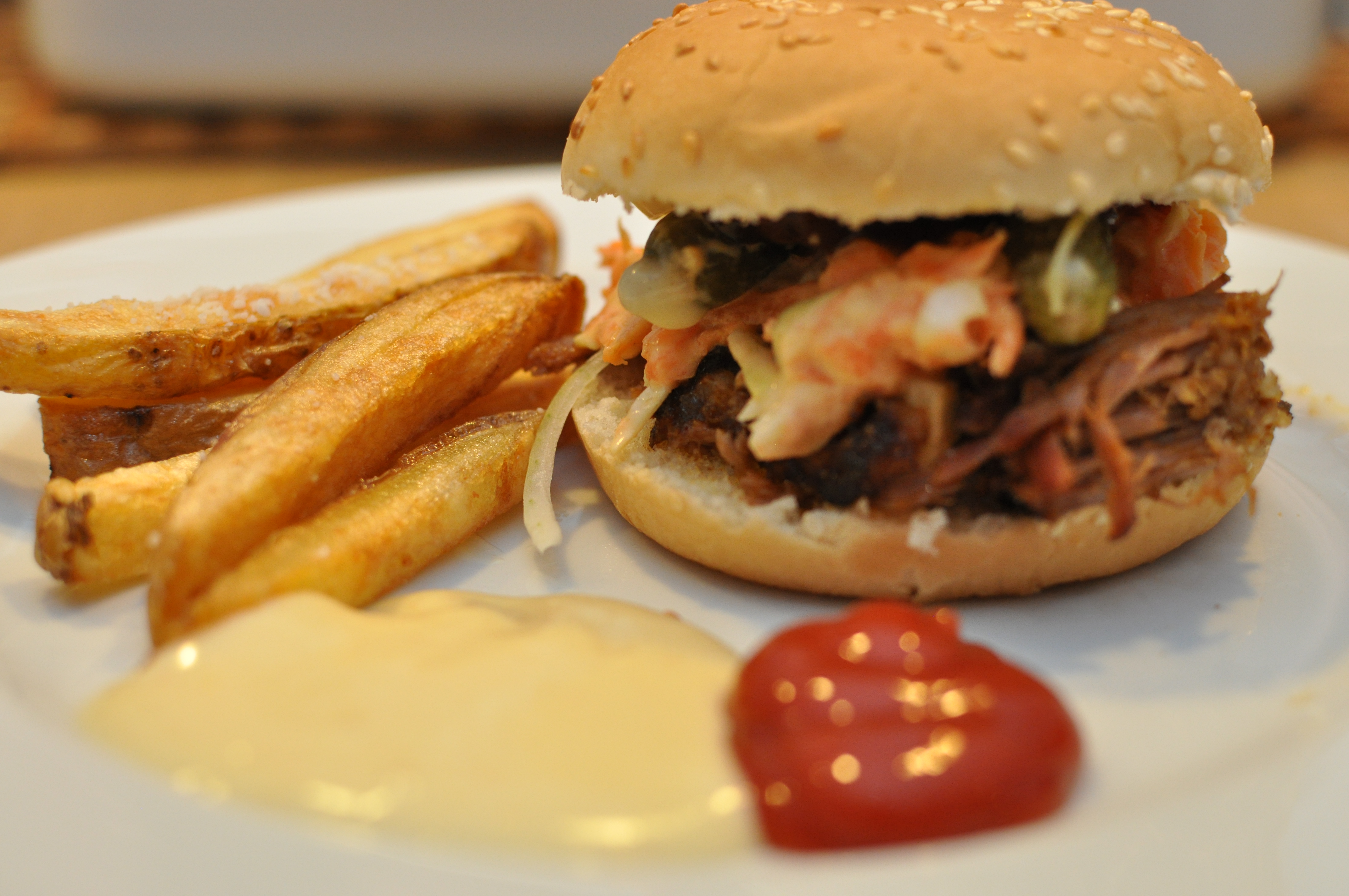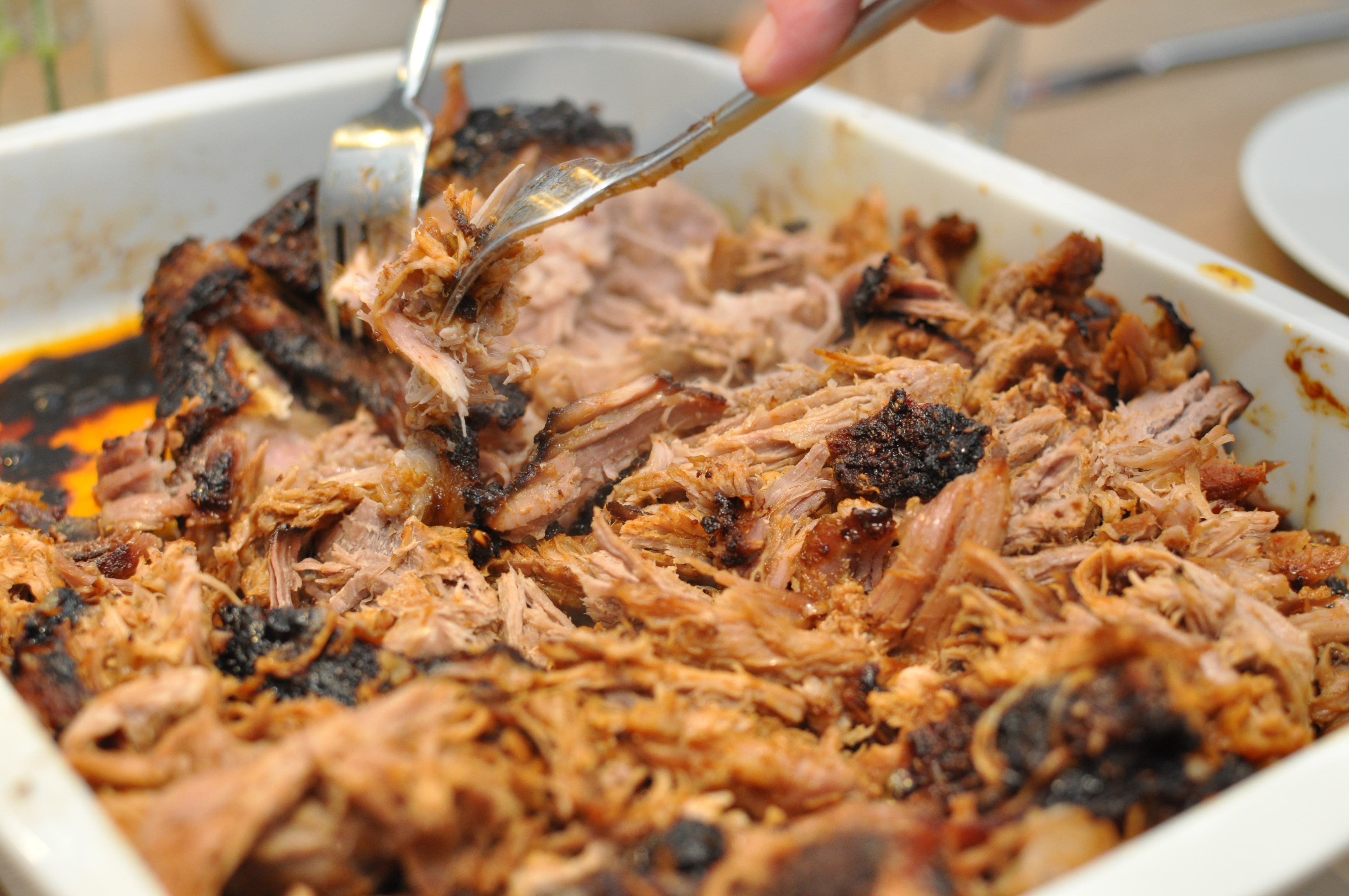 En rigtig søndags klassiker hjemme hos os er enten hjemmelavet pizza (her gerne i så store mængder at fryseren kan fyldes op) eller pulled pork der har simret i ovnen hele dagen og fyldt huset med en velsignet duft af krydret branket svinekød. I søndags havde vi mine forældre på besøg og vi skyldte dem at servere en rigtig god gang pulled pork for dem. I sommer havde vi dem på besøg til en weber grillet pulled pork, men af en eller anden grund blev den ikke varm nok i kernetemperaturen, så kødet trevlede ikke rigtigt og mad perfektionisten her var svært utilfreds med resultatet. MEN denne gang lykkedes det til perfektion – heldigvis 🙂