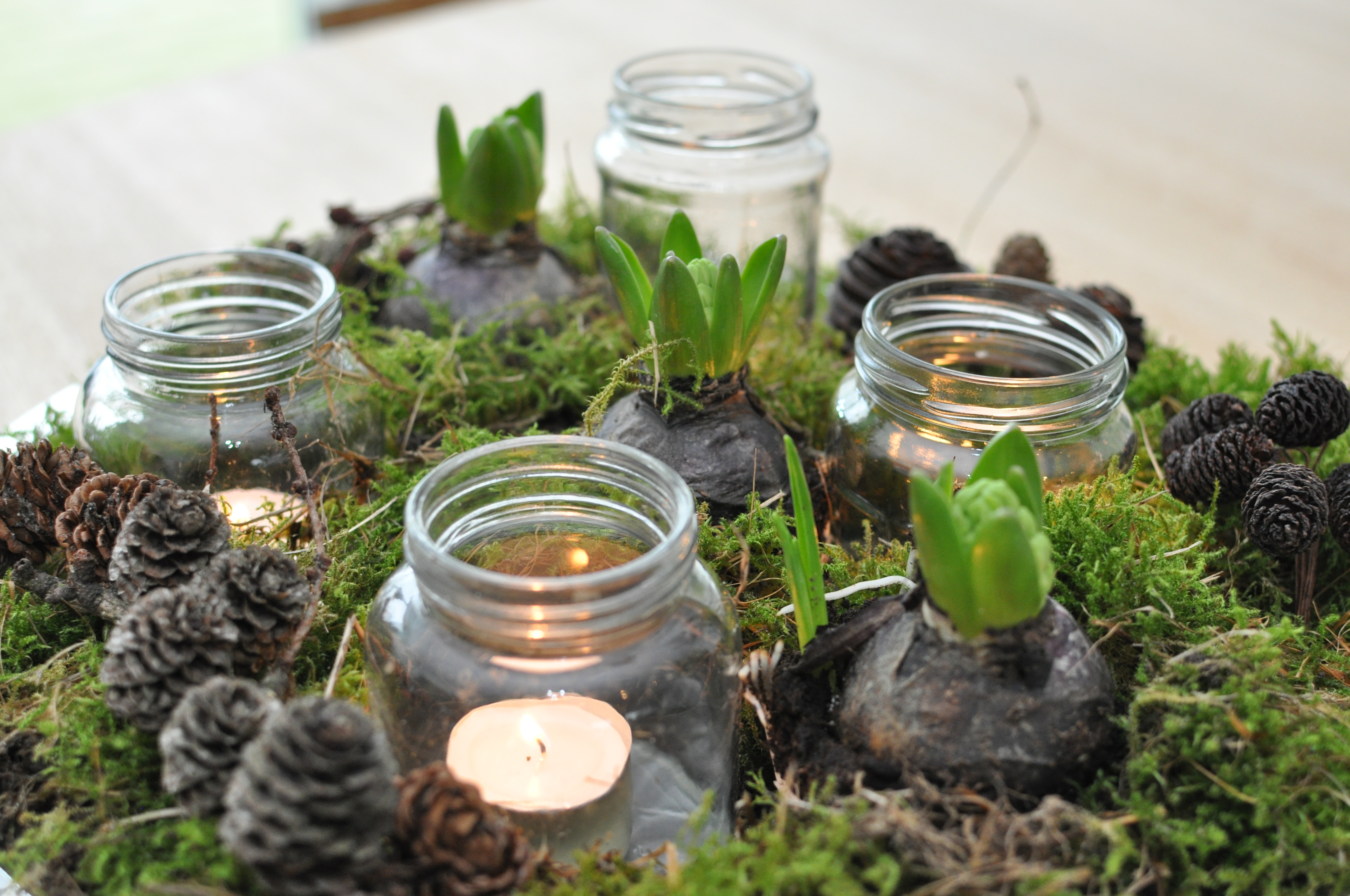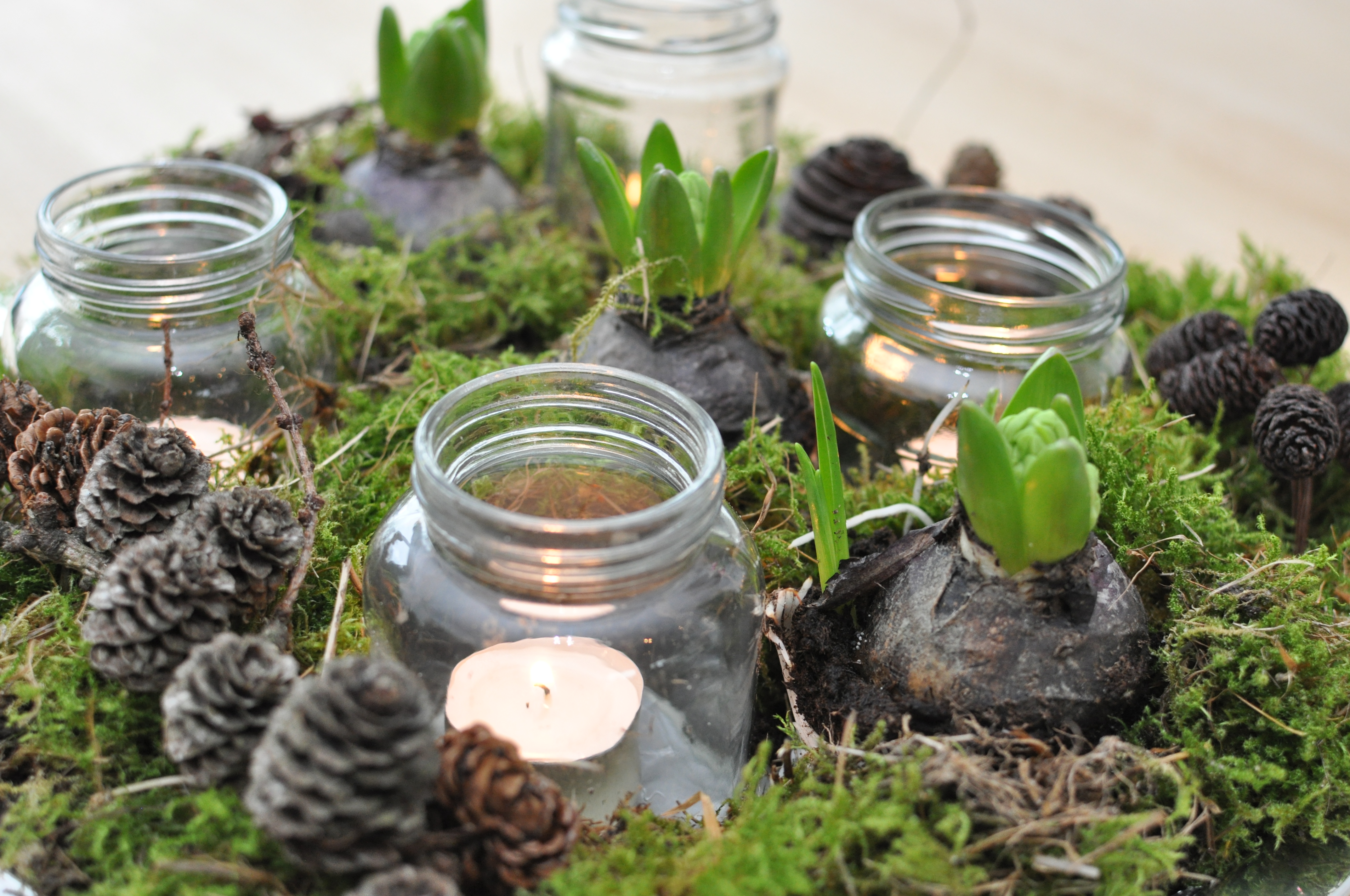 Her i juletiden er det selvfølgelig oplagt at mit første opslag i den nye kategori bliver et om jul. Her kan I se hvordan der bliver holdt 1. søndag i advent hjemme hos os. Der er lavet to adventsdekorationer, som er lidt anderledes end den traditionelt bundne krans. Jeg har været en tur i skoven og samle mos, kogler og snebær og ellers købt lys og hyacinter. En billig løsning og sjovt det ikke er som alle andre.