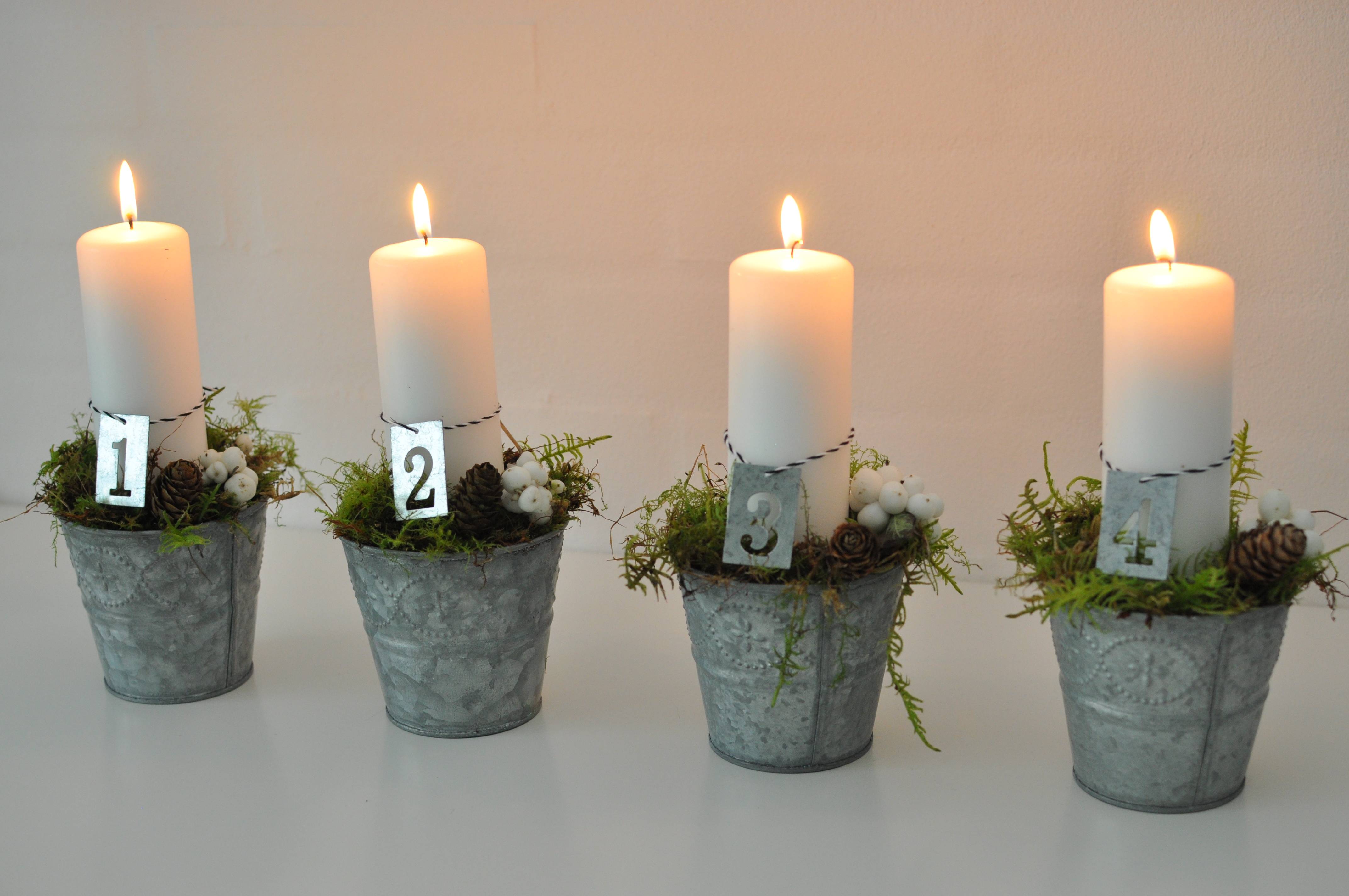 Min anden adventskrans er lavet af 4 zinkskjulere fra Fakta. De er fyldt med grus og så er der pyntet med mos, kogler og snebær. De 4 zinkskilte har jeg fundet i den lokale hobby forretning.