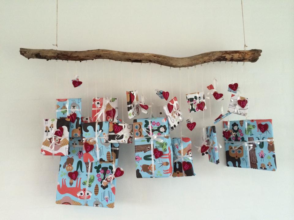 Jeg har lavet en lille sød pakkekalender til ham med en masse små gaver. Der gemmer sig både små rosinpakker, frugtstænger, pixibøger, farver osv. i gaverne og den er hængt op i vores køkken-alle-rum så vi kan kigge på den flere gange hver dag.