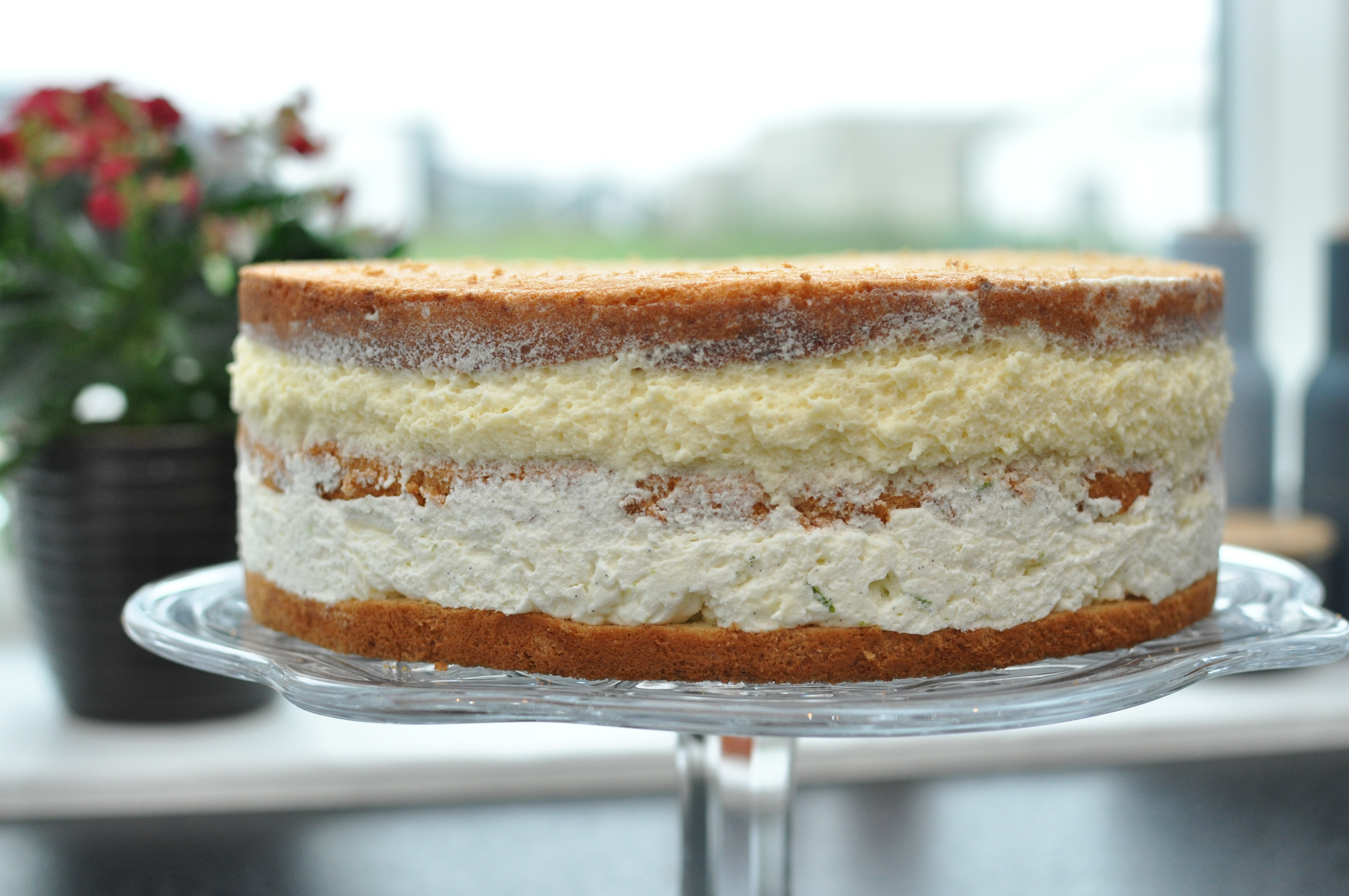Kagen skal nu samles i en kageform der er beklædt med folie eller f.eks. en plastiklomme delt i 2 og tapet sammen (gøres for kagen ikke går fra hinanden når formen fjernes). Start med en bund, herefter limemoussen, 1 bund, så chokolademoussen og til sidst en bund mere. Sæt kagen i køleskabet i 2 timer.