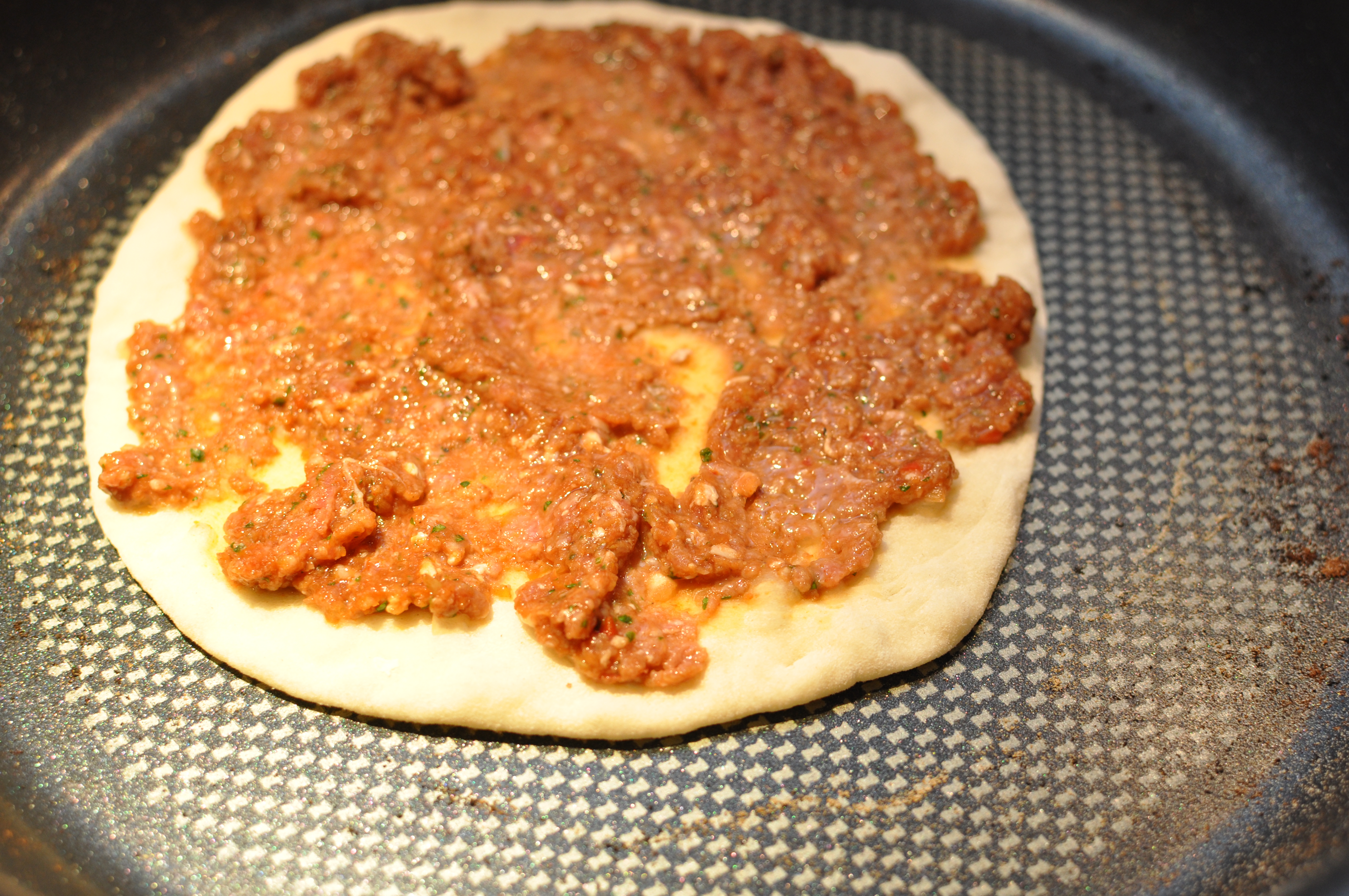Del dejen i 12 stykker og tril dem til kugler. Drys rigeligt med mel på bordpladen og rul dejen papirstyndt ud. Jeg lagde dejen over på en pizzaspatel inden jeg puttede det rå kødfyldet på. Der skal ca. 1 spk fyld på hver lachmacun.