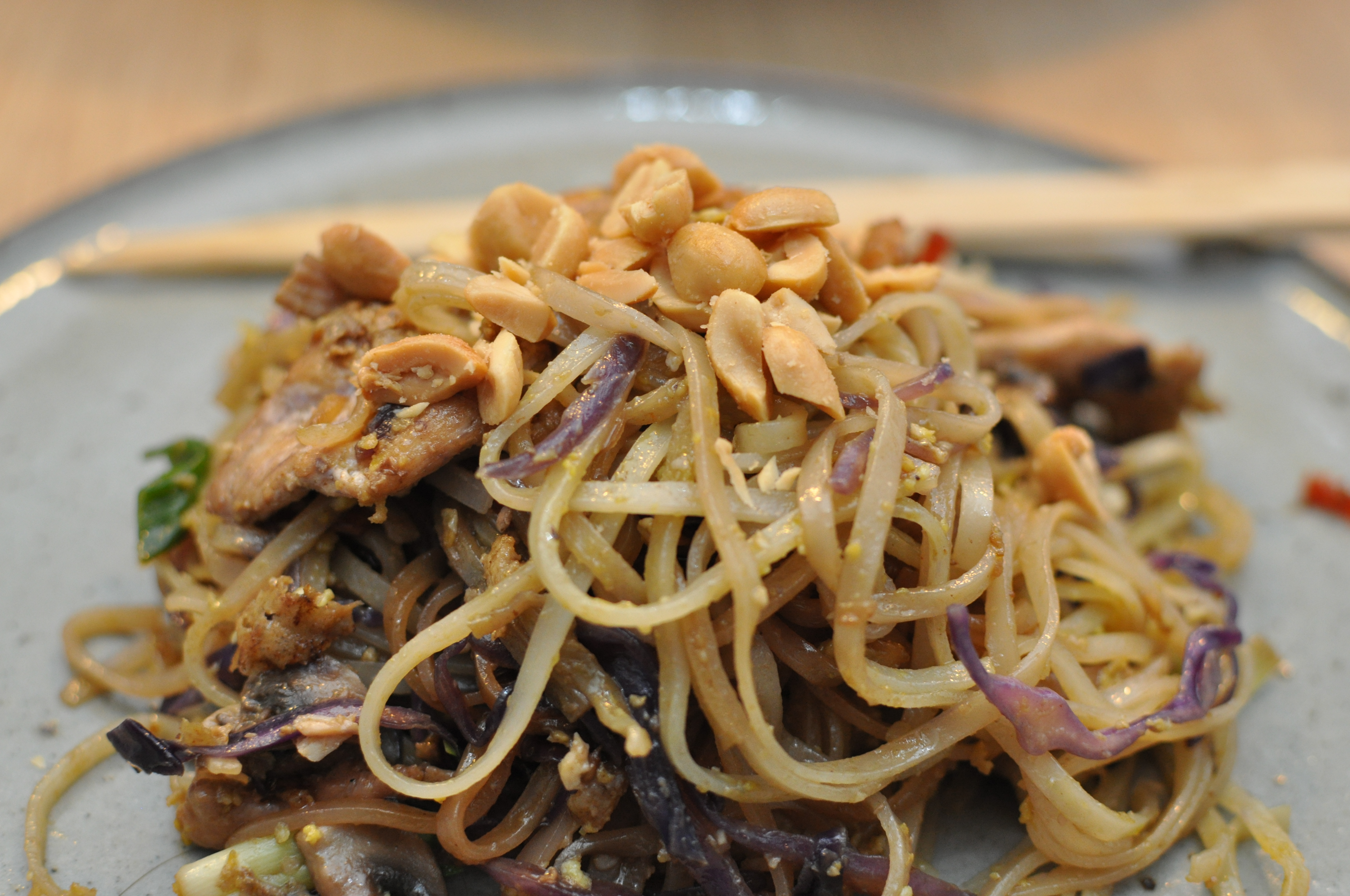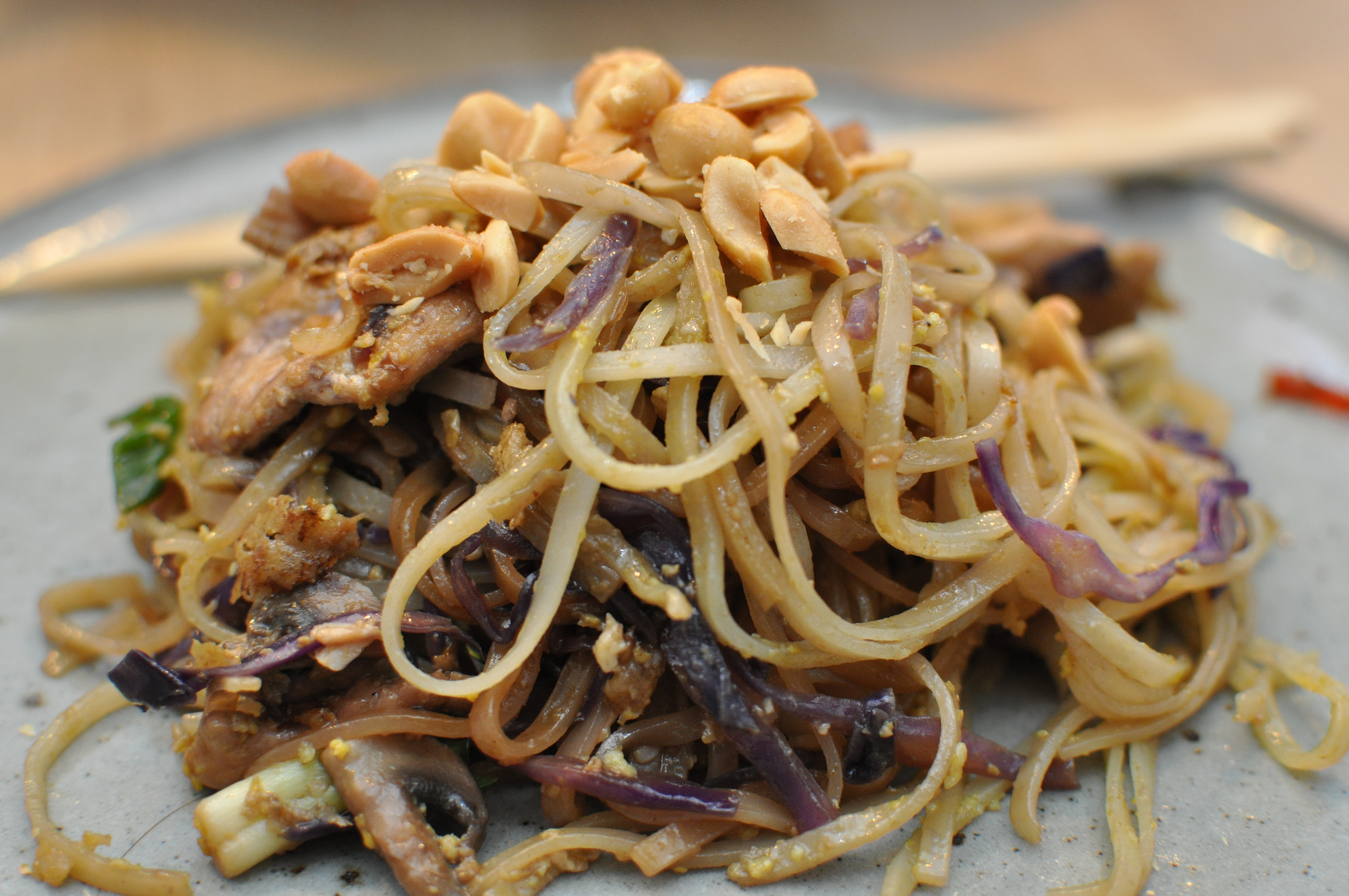 Jeg forelskede mig kulinarisk i to retter: Green curry og Pad thai (stegte nudler). Jeg har forsøgt at efterligne begge retter mange gange siden, men jeg har endnu ikke ramt 100 % rigtigt endnu. Men i aften kom jeg ret tæt på med denne version af Pad Thai med kylling.