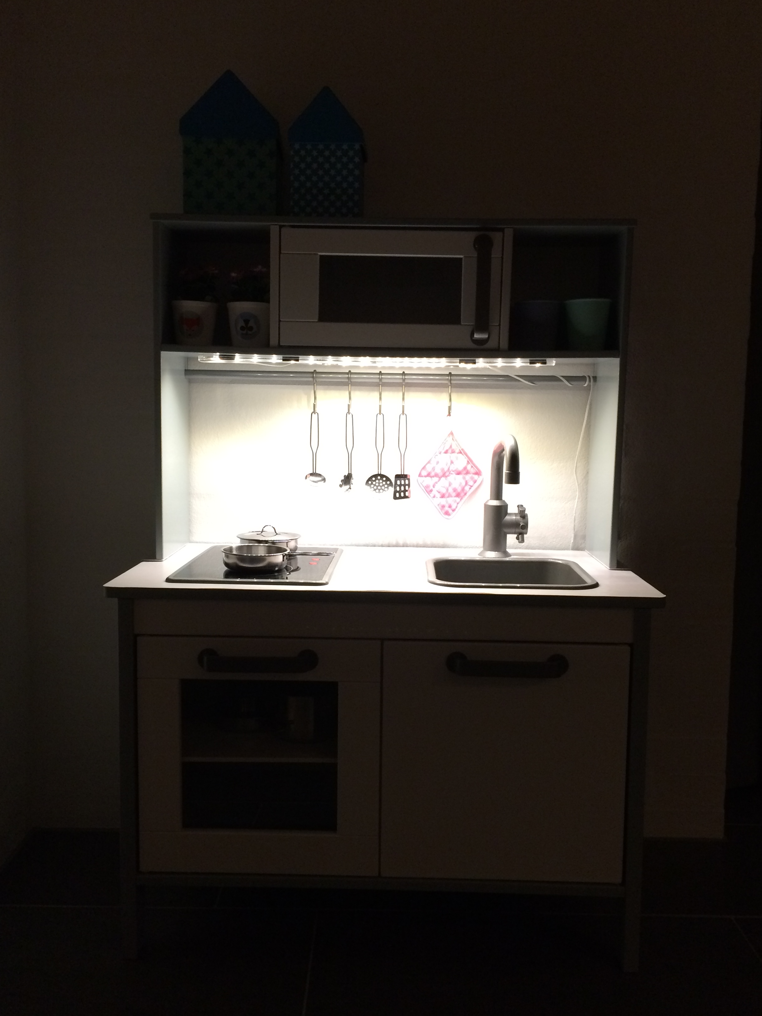 Vi har under hylden med den lille mikroovn opsat en LED-lyskæde fra Harald Nyborg til at give et lille hyggelys over bordet.