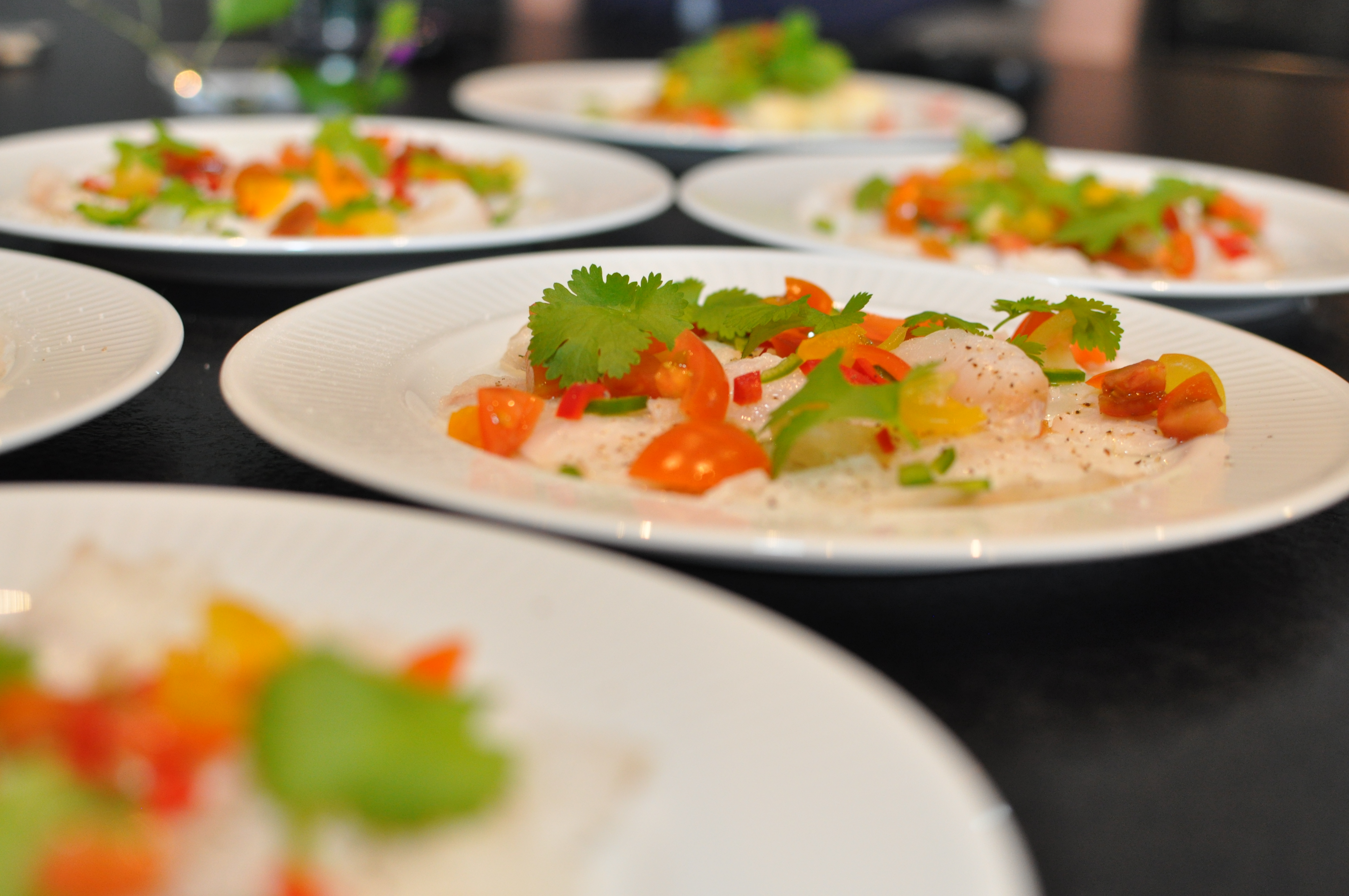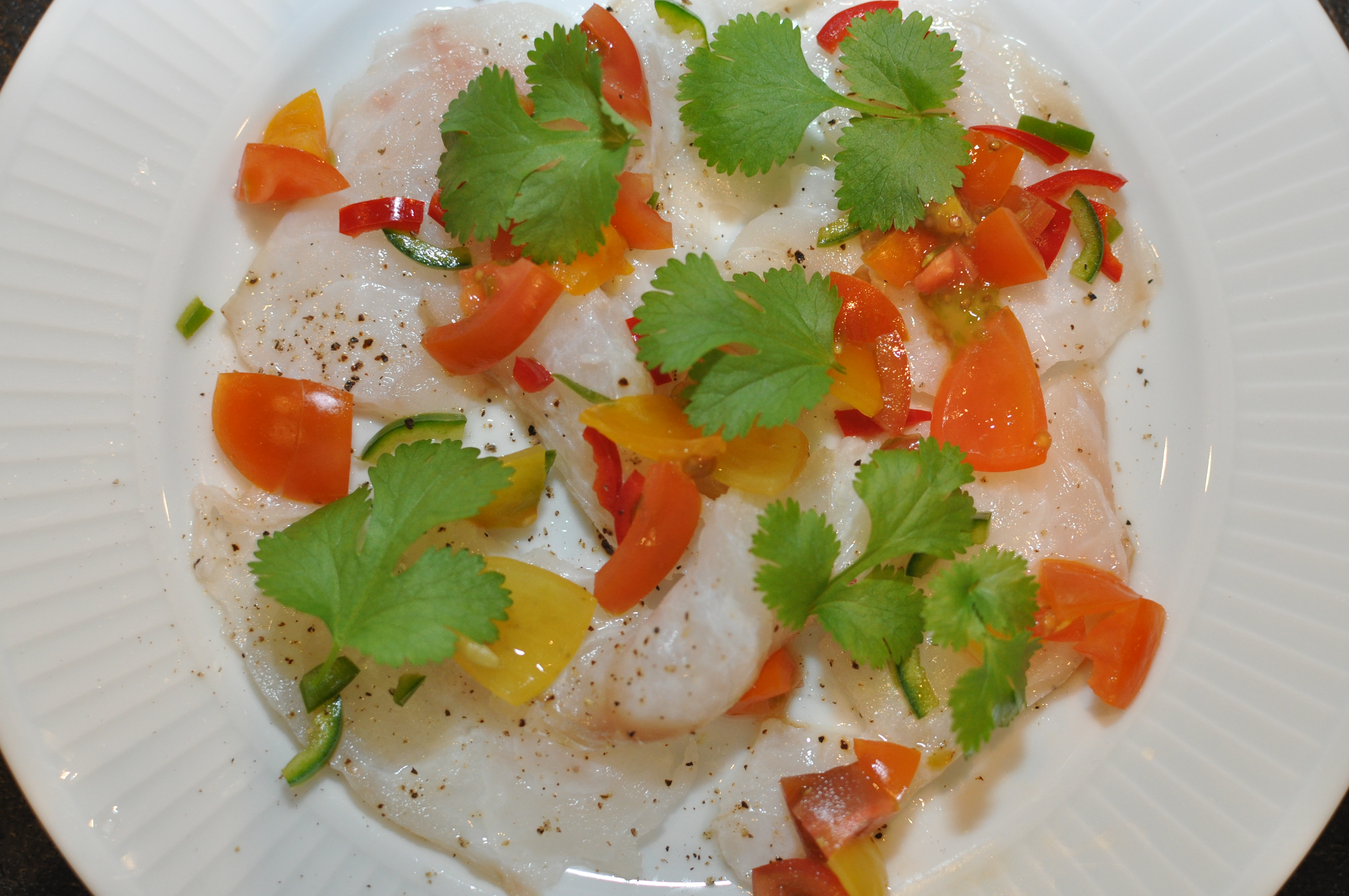 Frys den friske fisk ned i minimum 24 timer og tå den op i køleskabet. Skær den rå fisk i silketynde skiver og læg den i et enkelt lag på en tallerken. Pynt med finthakkede tomater i forskellige farver og chili, der er flækket på langs (tag streng og kerner ud) og skåret i tynde strimler.