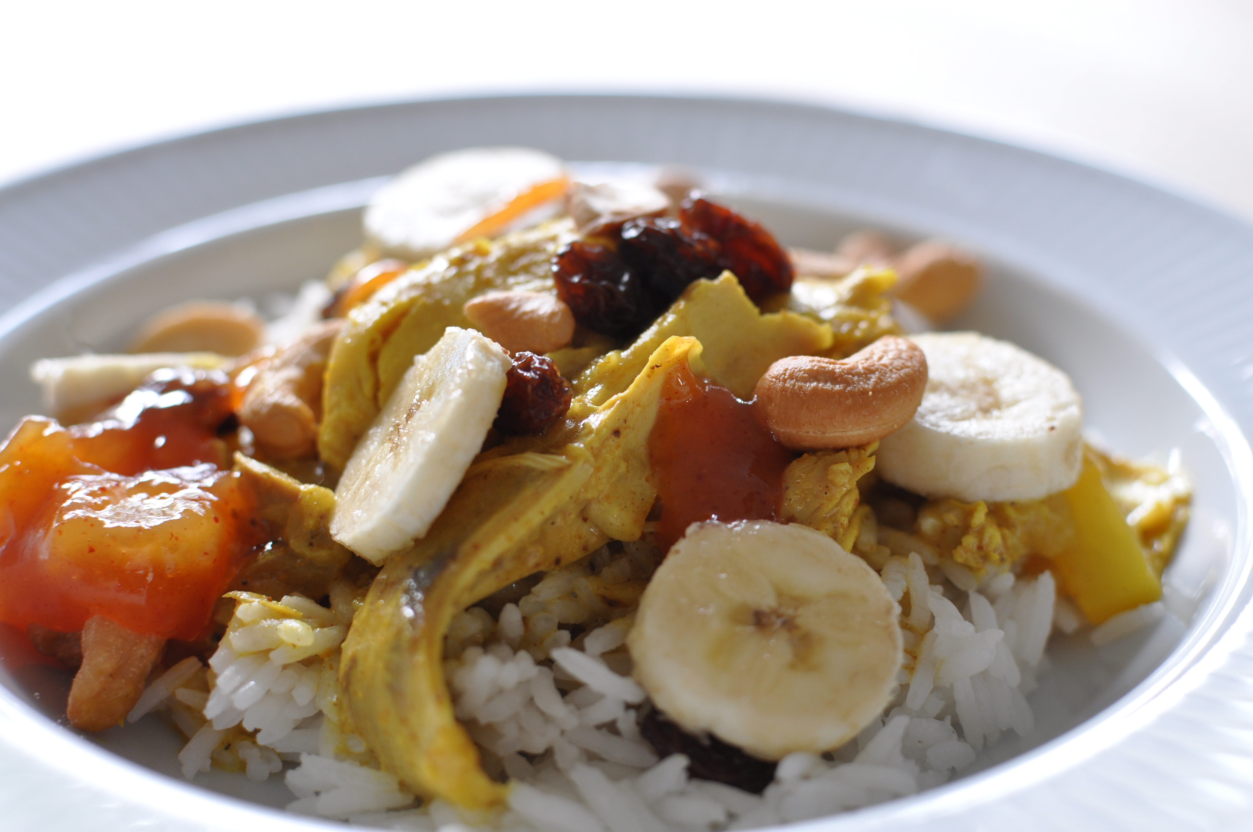 Jeg serverer gerne retten med kogte basmatiris, rosiner, bananer, cashewnødder og hjemmelavet mangochutney.