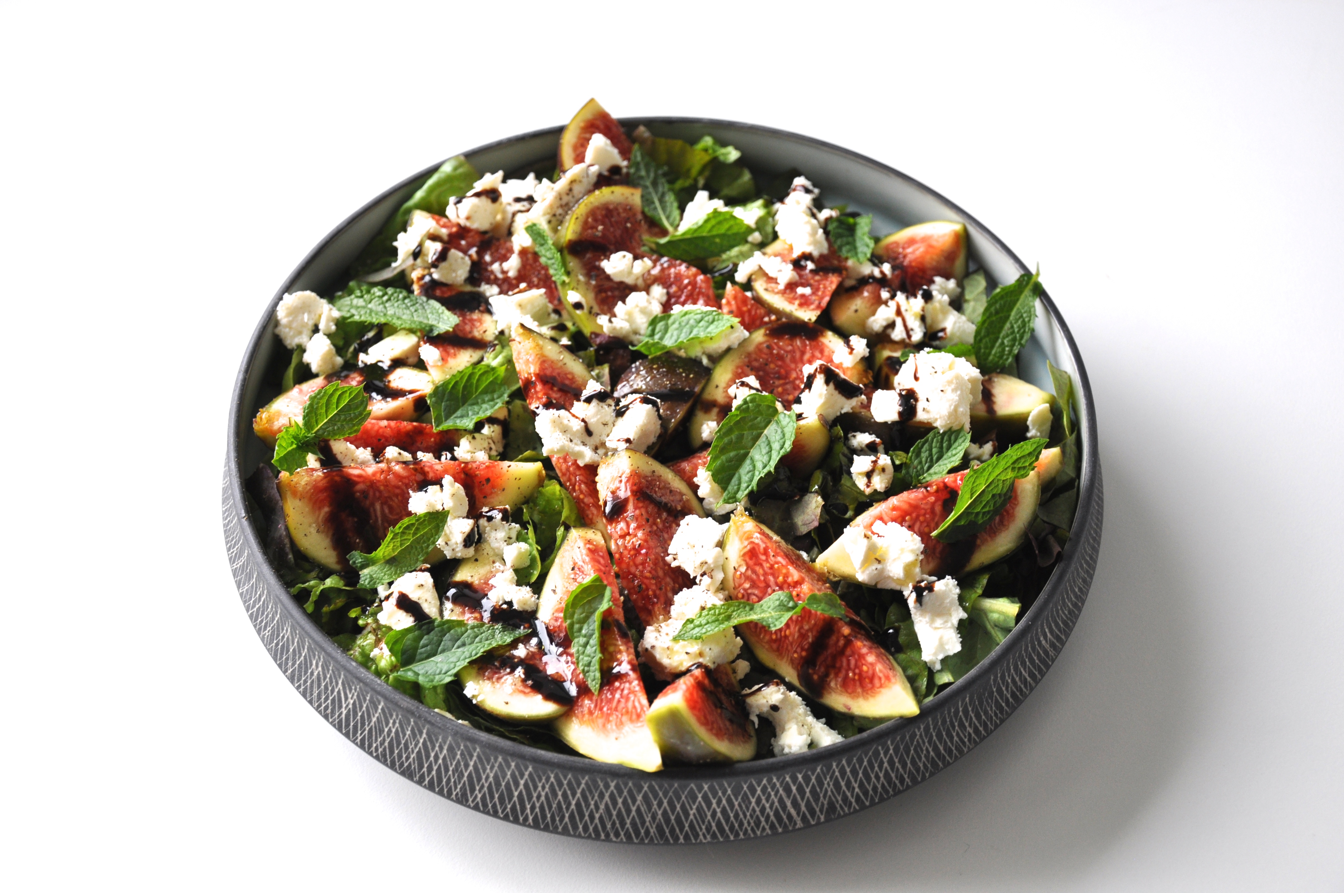 Salaten strimles og lægges i bunden af et lille fad. Fignerne skylles og skæres i både der lægges ovenpå salaten. Drys med fine mynteblade og bræk små stykker frisk feta over. Til slut kværner du frisk peber over og hælder lidt olivenolie og balsamicoglaze over.