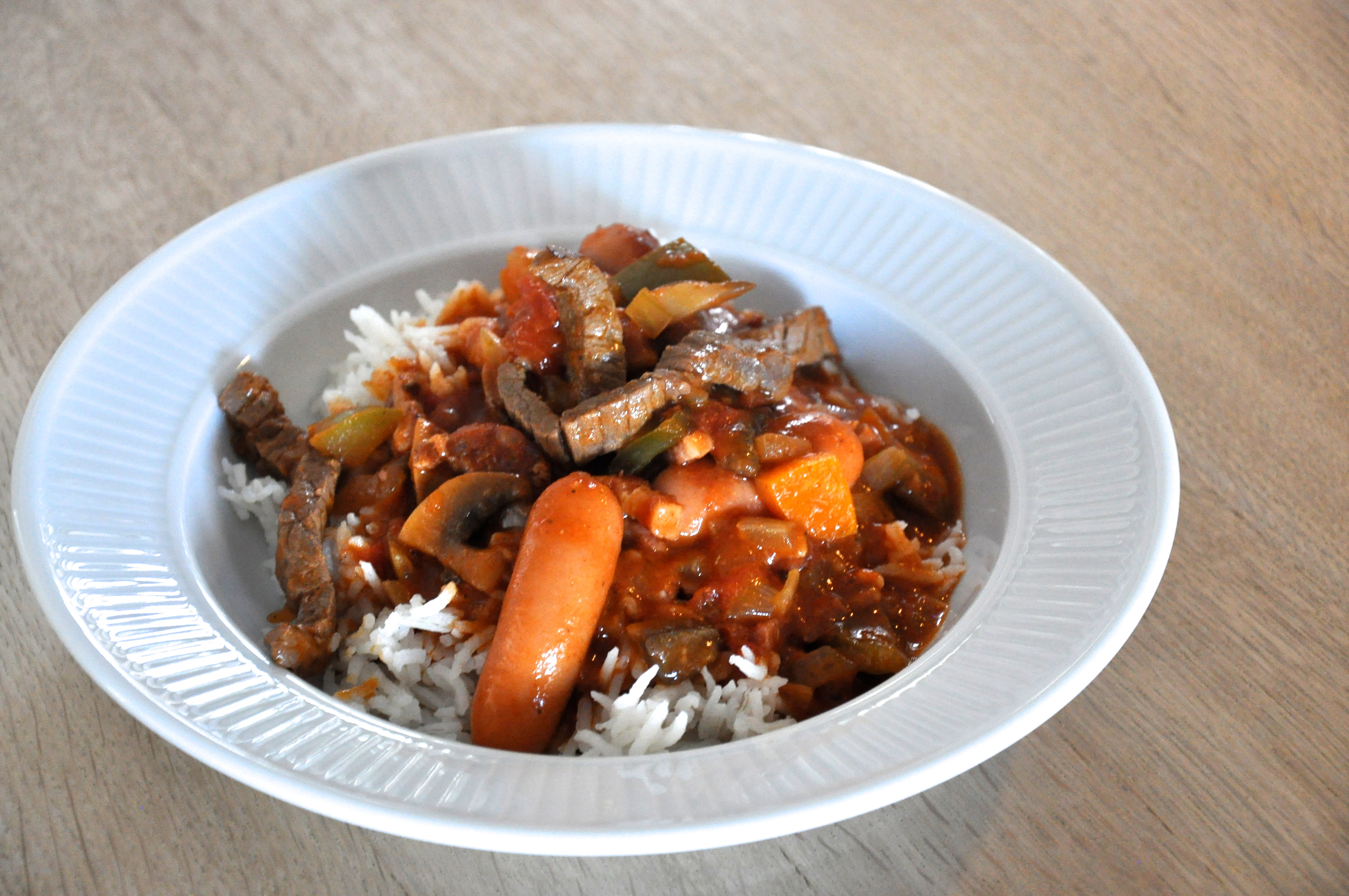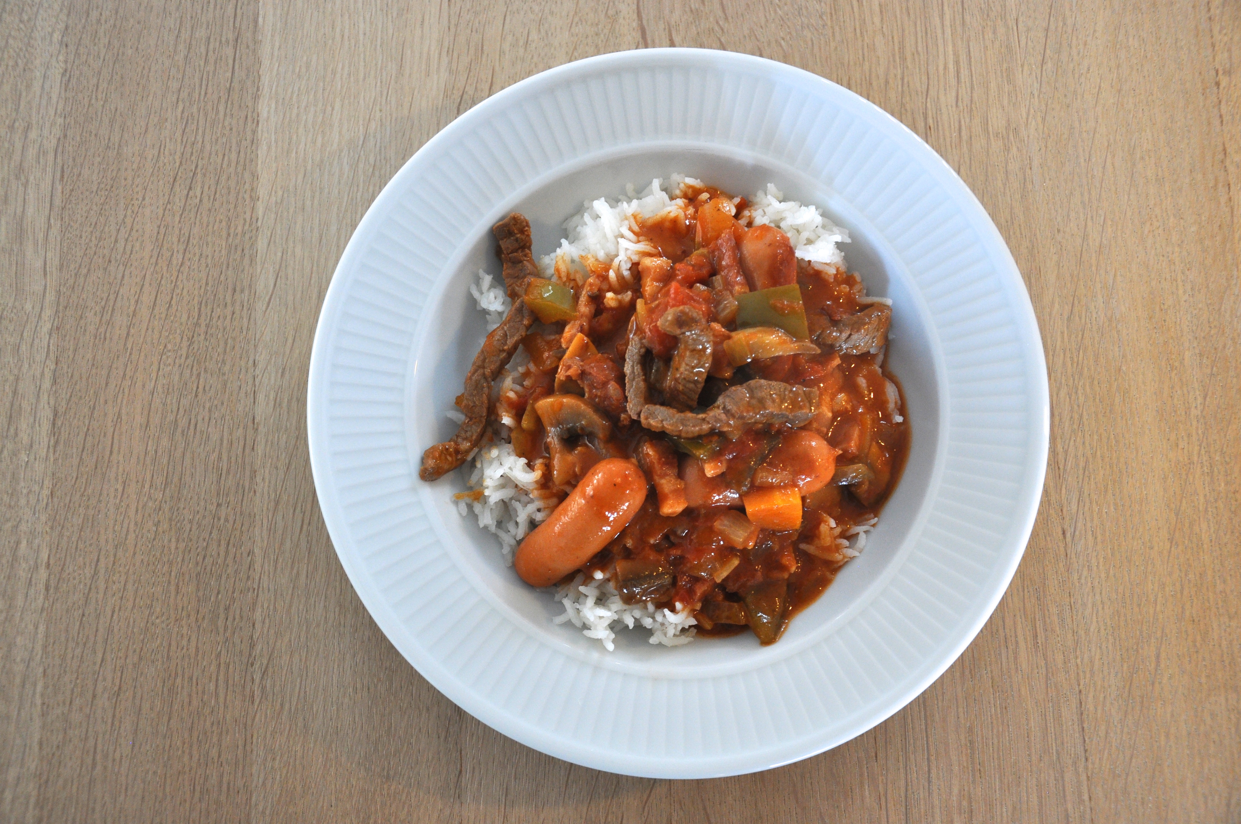 Du skal nu have oksekødet tilbage i gryden og sammen med det kommer du tomatpure, hakkede tomater, sambal oelek, sennep, honning og boullion. Lad retten simre under låg i 45 minutter. tilsæt nu fløden og lad retten simre videre i 30 min.