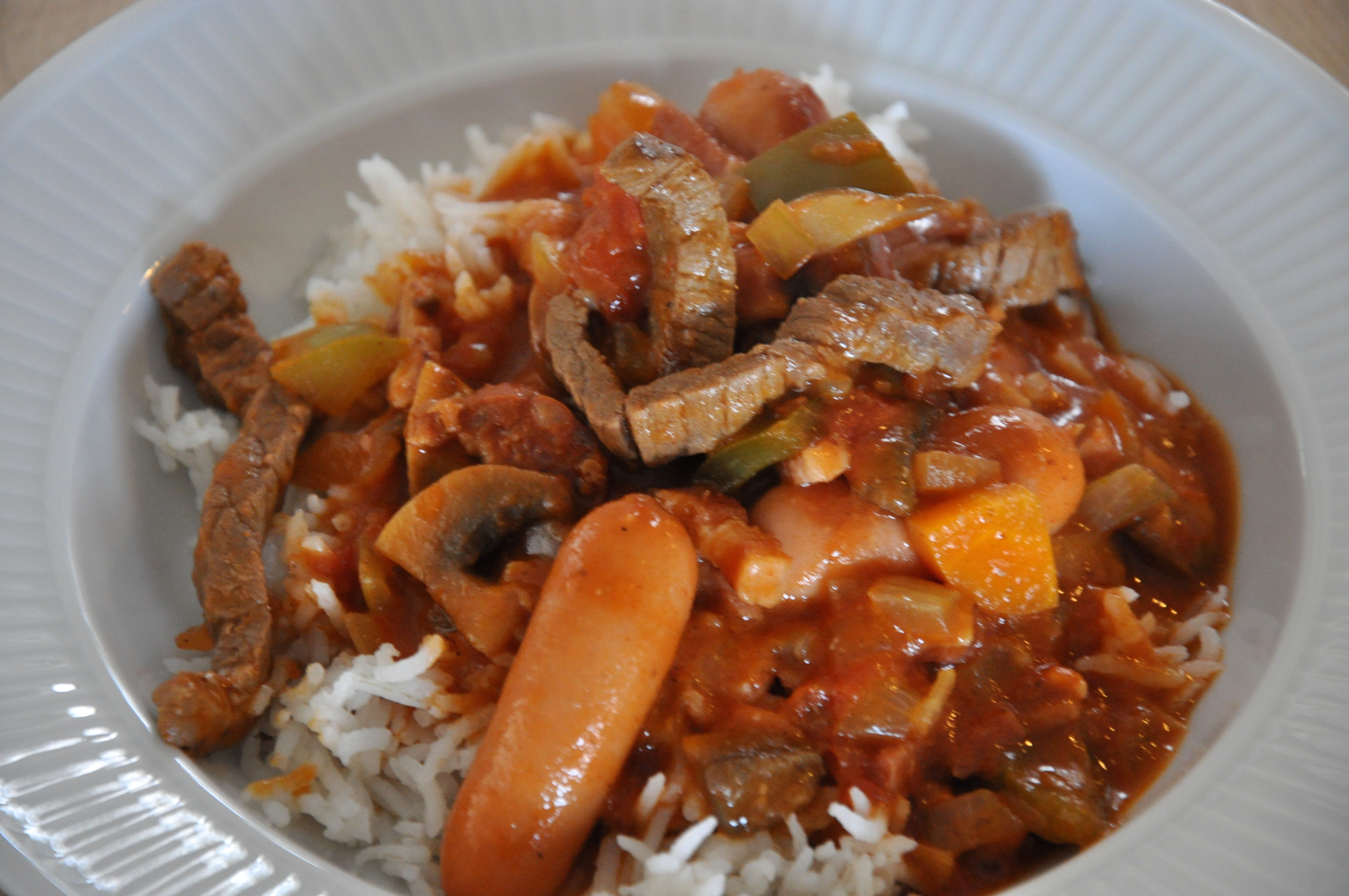 Et sikkert hit til mænd er ofte kød, kød og masser af kød. Det gælder også hjemme ved os hvor Antons favoritter især er pølser og bacon og Troels der gerne sætter pris på godt kød i det hele taget. Retten her indeholder 4 forskellige slags kød og skal simre et par timer og give masser af smag. Og som de fleste gryderetter smager den endnu bedre dagen efter når den rigtigt har fået lov at sætte sig og trække. Jeg har puttet vores rester i fryseren. Erfaringen fra sidst siger at det er godt at have rester at tage op til de første dage og uger med en lille ny baby i huset.
