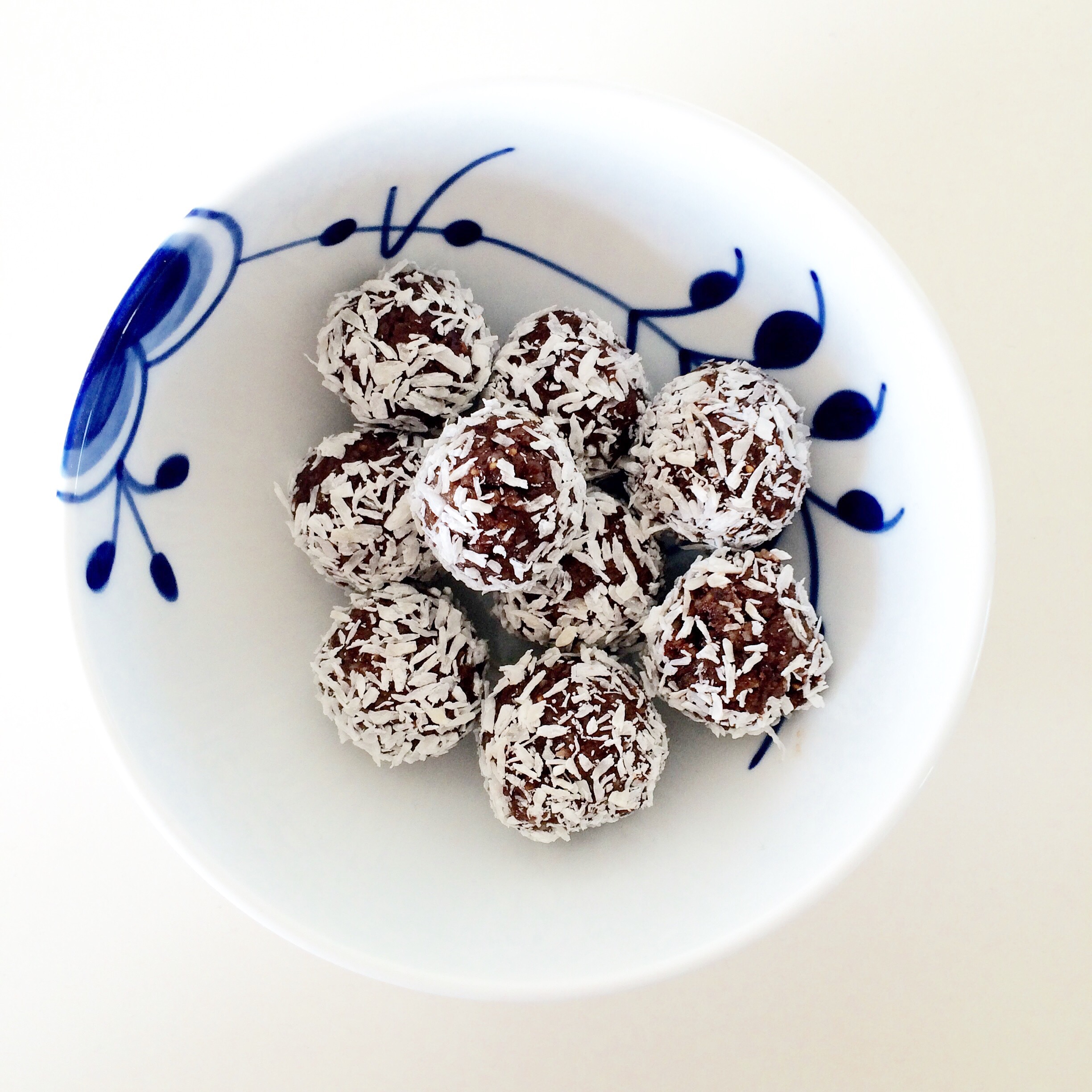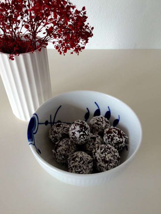 Jeg kan bedst lide at vende kuglerne i kokosmel men du kan også bruge at drysse dem med lidt kakao eller lakridspulver.