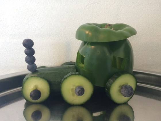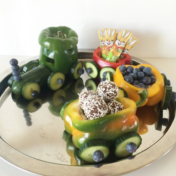 Tænkte ungerne skulle have lidt sjovt at hygge med til eftermiddag så lavede dette søde lille tog af agurk, peberfrugt og blåbær. Det blev fyldt med lidt chokolade, dadelkugler og blåbær.