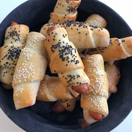 Del dejen i 3 kugler, rul dem ud og skær hver i 8 trekanter og rul pølsehornene.