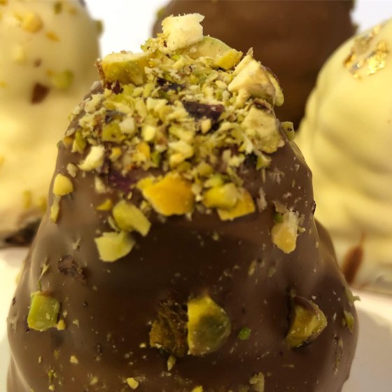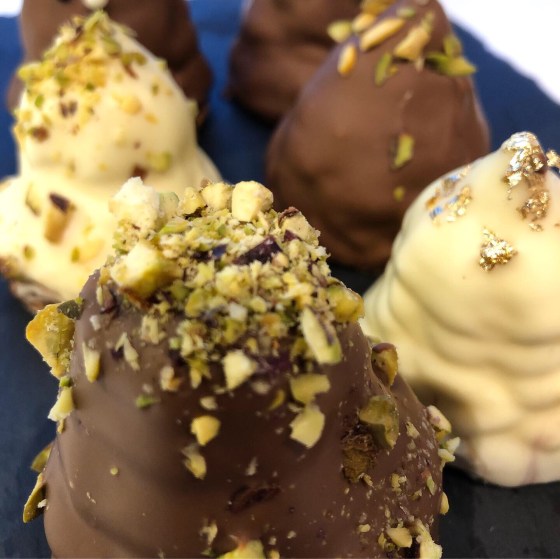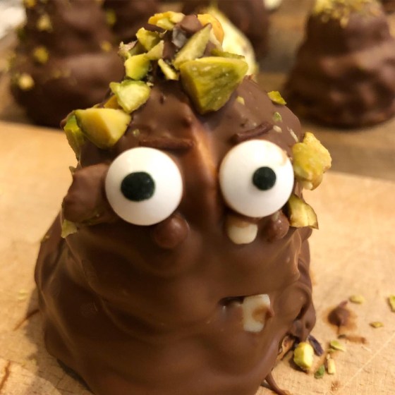 Når det er “stivnede” og tørrede lidt ud tages de ud af køleskabet. Chokoladen smeltes over vandbad og flødebollerne dyppes heri når chokoladen er 30 grader varm. Pynt med dit yndlings toppoint og lad gerne børnene være med. Mine drenge lavede monsterflødeboller.