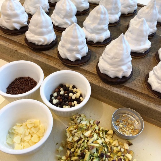 Lav fine toppe af flødebolleskummet på kiksene og sæt dem på køl i 1-2 timer.