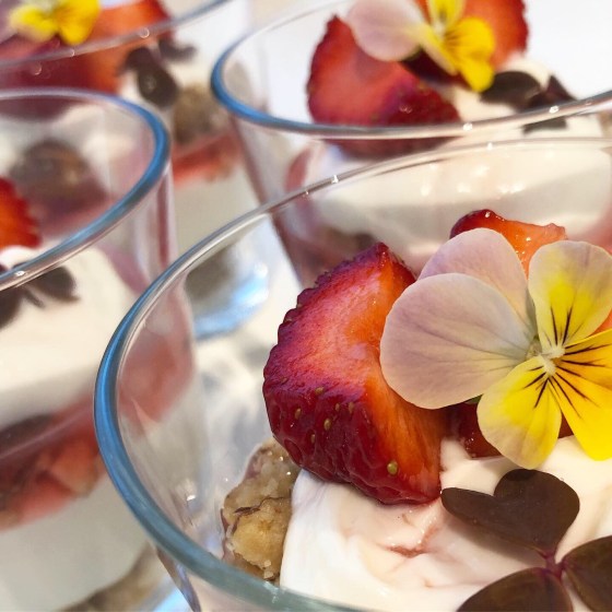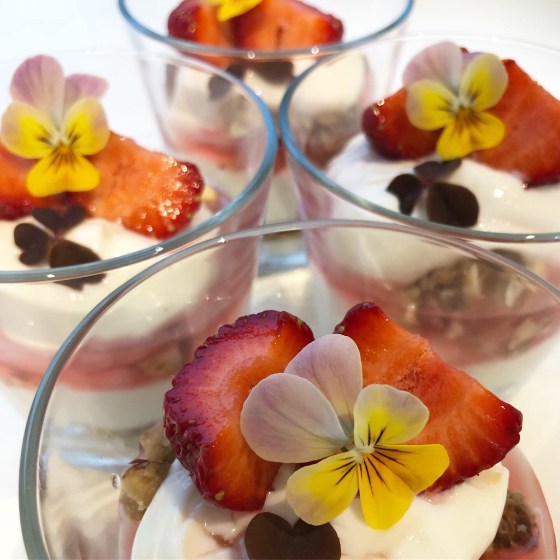 Anret desserterne i lag som en trifli og pynt med et delt jordbær, skovsyre og en hornviol på toppen.