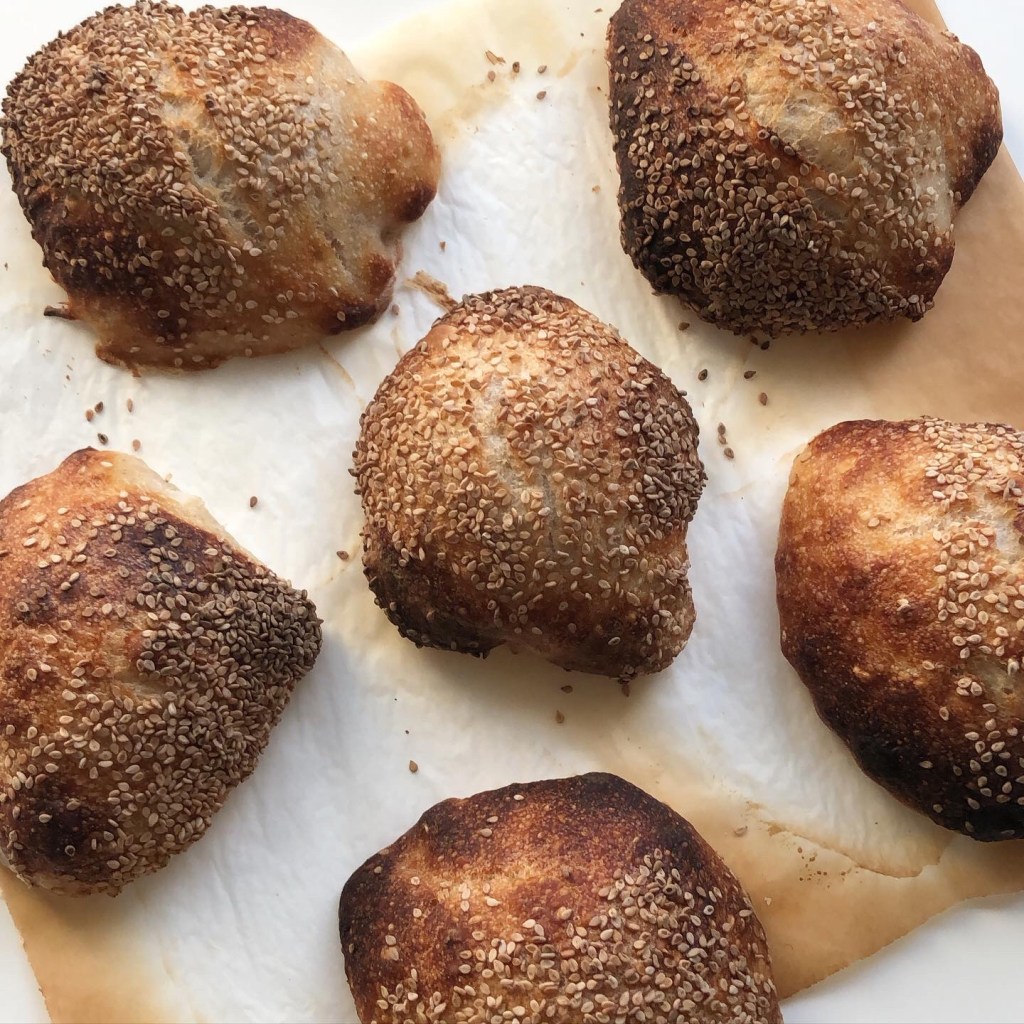 Varm ovnen op til 250 grader med en pizzasten eller et bagestål i. Lad den varme i en times tid. Vend dejen ud på bordet og drys godt med sesam over. Del dejen ud i 10 stykker med en dejskærer og læg dem på pladen. Bag bollerne i ca. 12 minutter eller til de er blevet godt gyldne.